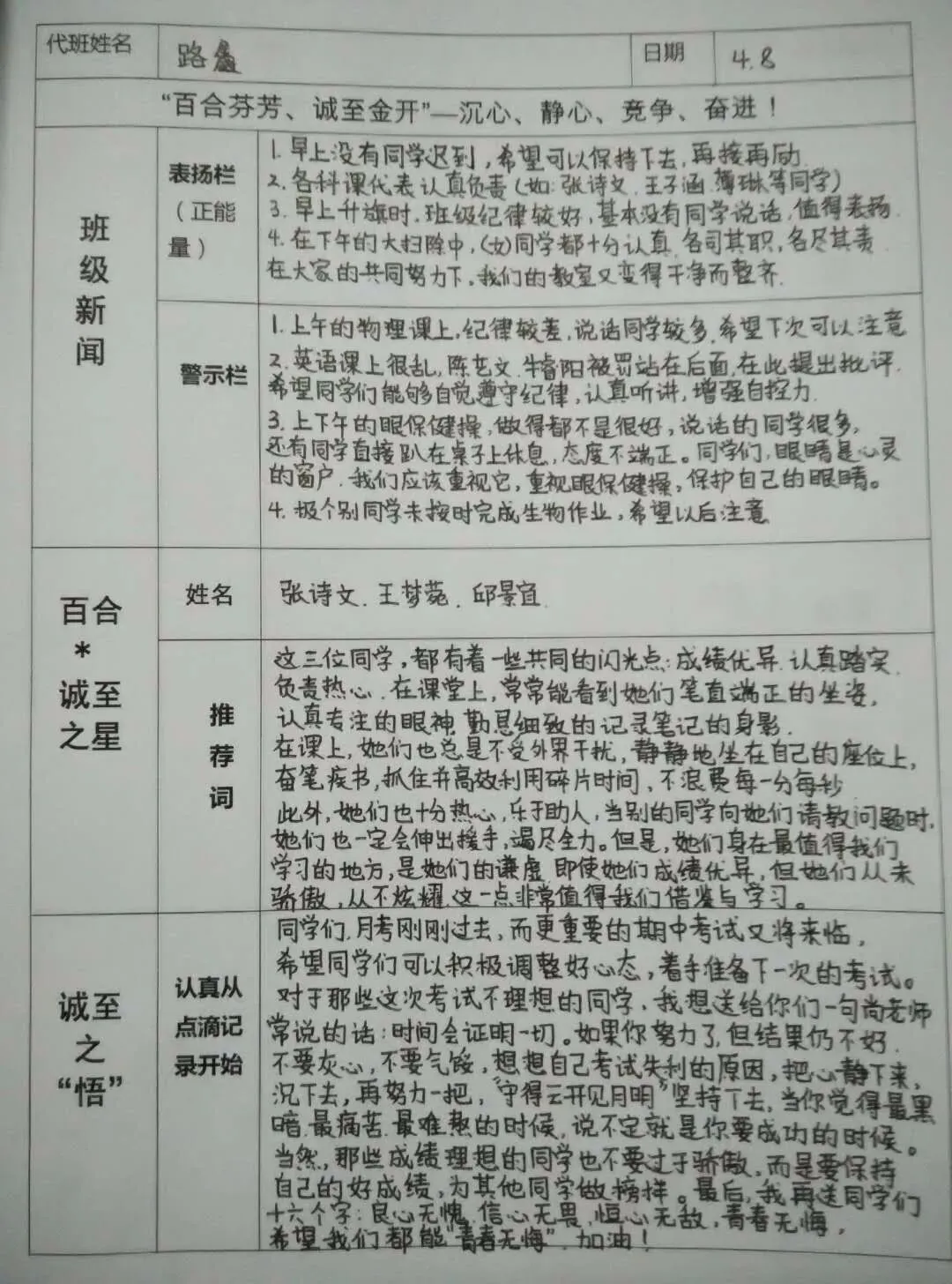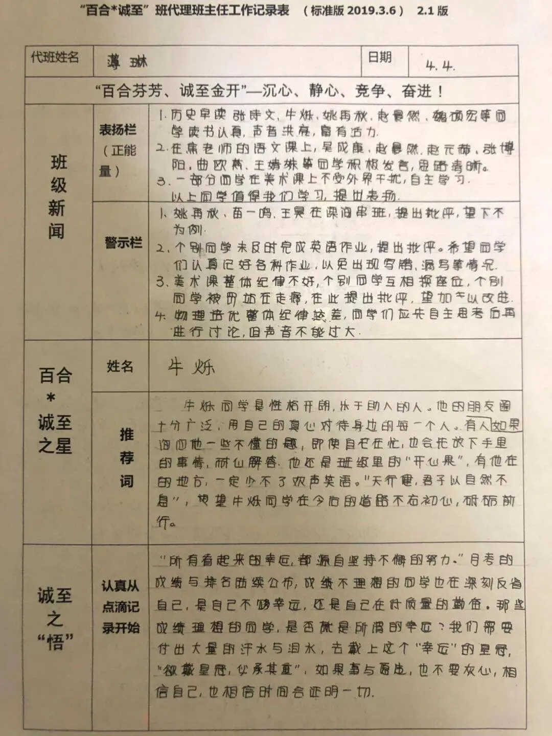 尚老师管学生注重潜移默化,如春夜喜雨润物无声。她让学生自我管理,学生轮流做代理班主任。在这一天里要带领大家学习,检查学生表现,与任课老师对接等等,晚上要汇总为《百合*至诚代理班主任工作记录表》,内容包含班级新闻(表扬、批评)、班级之星和工作感悟等。尚老师如是说,一个人在教导别人的时候,对相关知识会掌握得特别牢固。同样,一个孩子在管理别人的时候,首先会成为优秀的自己。