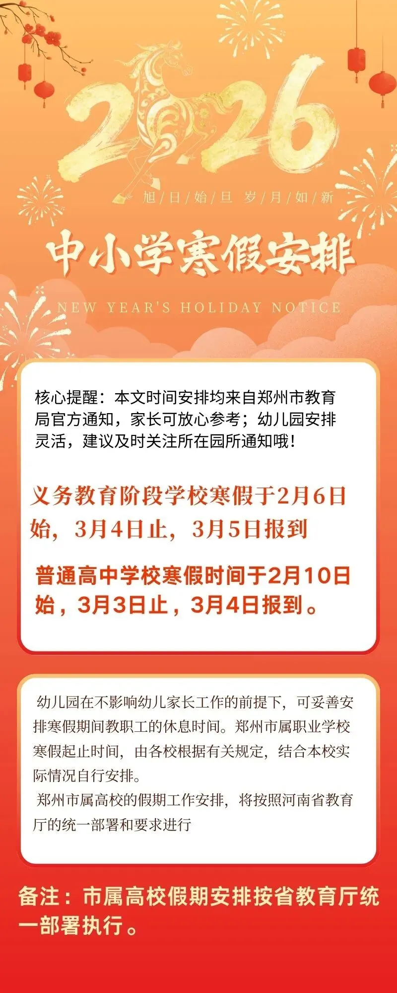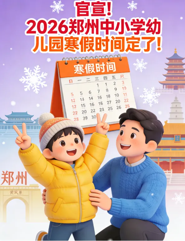 家长们注意啦!郑州市教育局正式发布2026年寒假工作安排通知,中小学、幼儿园放假及报到时间已明确敲定!期末临近,提前收好这份时间安排表,帮孩子做好假期规划,度过一个安全、充实又快乐的寒假吧~