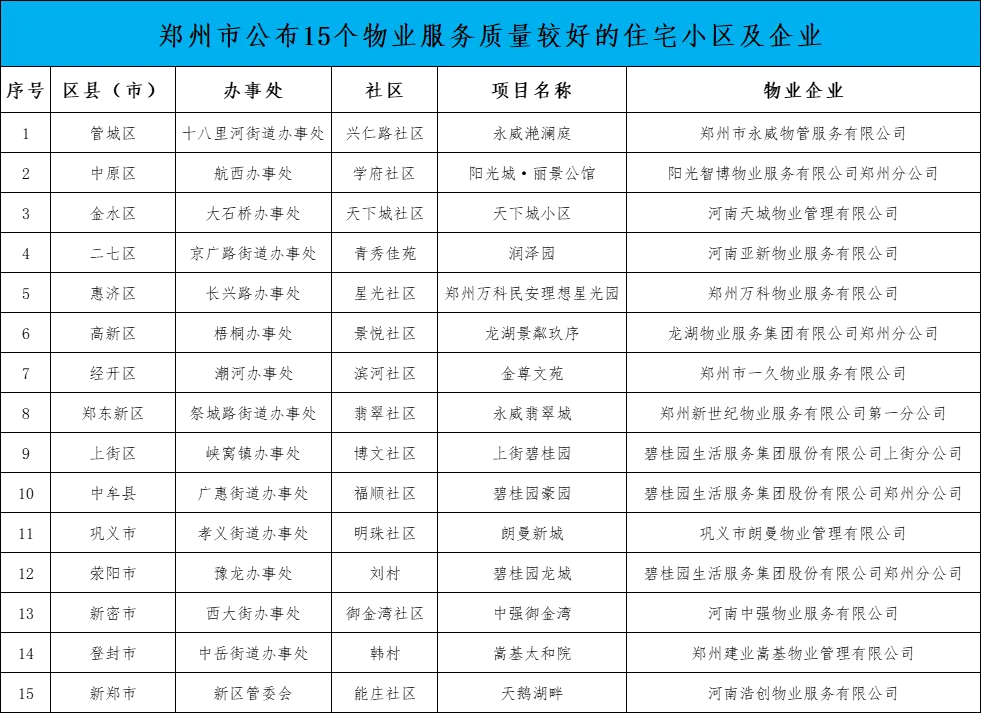 附:郑州市公布15个物业服务质量较好的住宅小区及物业企业名单