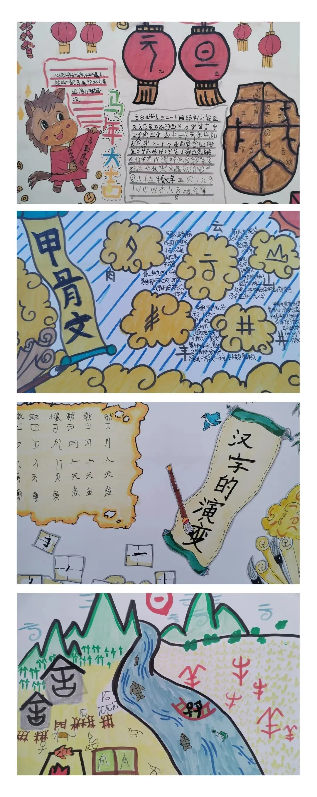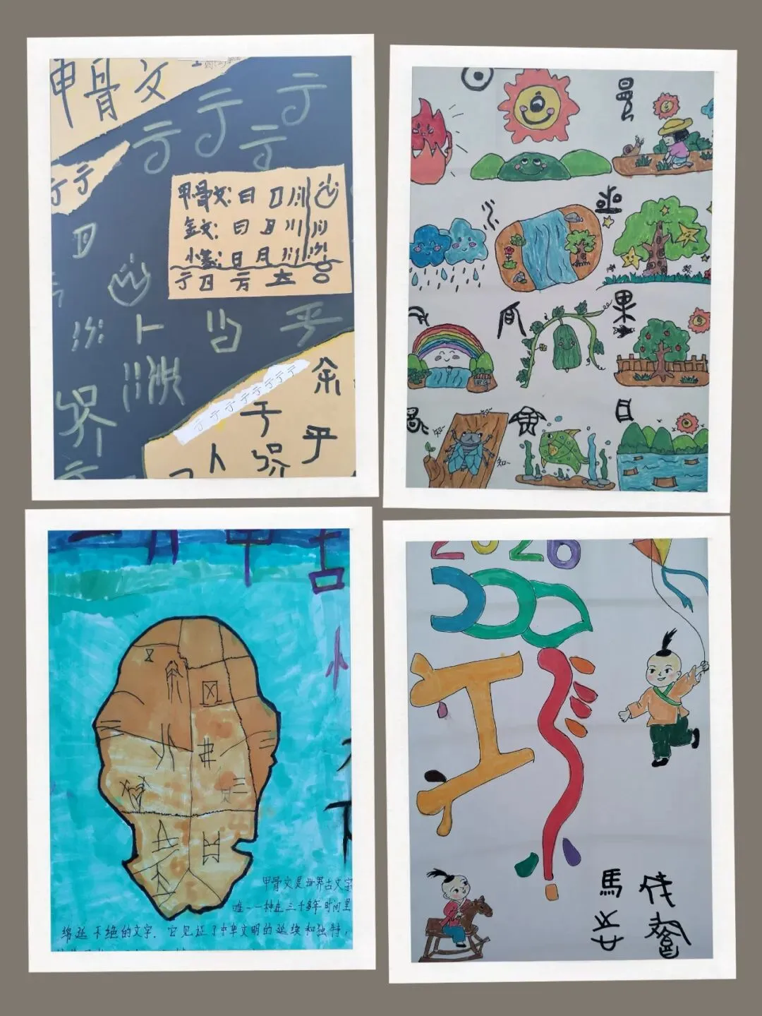 活动前期,语文教研组的老师们精心指导。课堂上,老师们借助殷墟甲骨文物图片、趣味动画短片,向学生讲解甲骨文的起源、演变历程,以及“日”“月”“山”“水”等基础文字的字形特点。从线条粗犷的甲骨卜辞到生动形象的象形文字,学生们沉浸在古老文字的奇妙世界里,纷纷感叹古人的智慧与创造力。随后,美术老师结合甲骨文的象形特征,指导学生将文字转化为绘画元素,鼓励大家发挥想象,为文字添加色彩与背景,让沉睡的甲骨文字“活”起来。