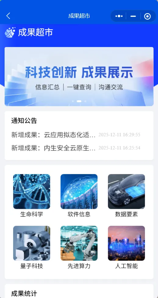 空间布局上,成果超市前端构建便捷高效的成果上架通道,后端依托专属设备,通过扫码即可实时查询项目成果全方位信息,实现成果信息直观呈现、精准触达,构建“即时展示 - 现场对接 - 高效转化” 的一站式服务闭环,确保 “所见即所得、对接即落地”。