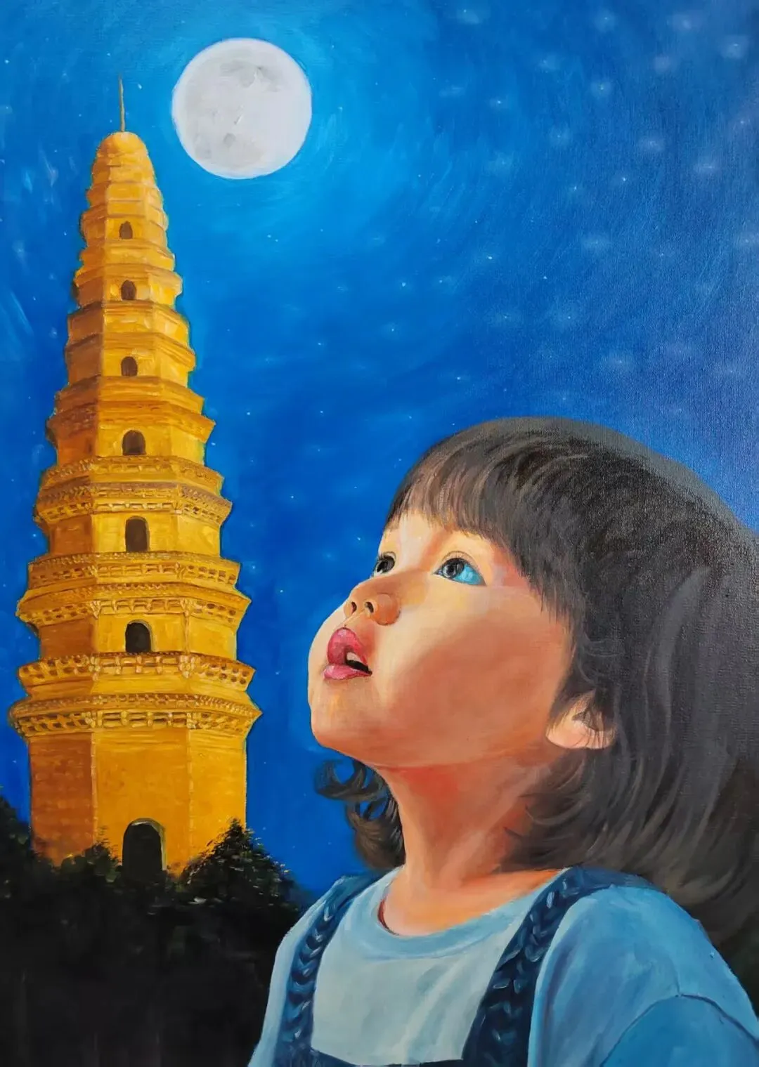 耿艳青 《月落滑州。明福寺塔与童》 70×50cm