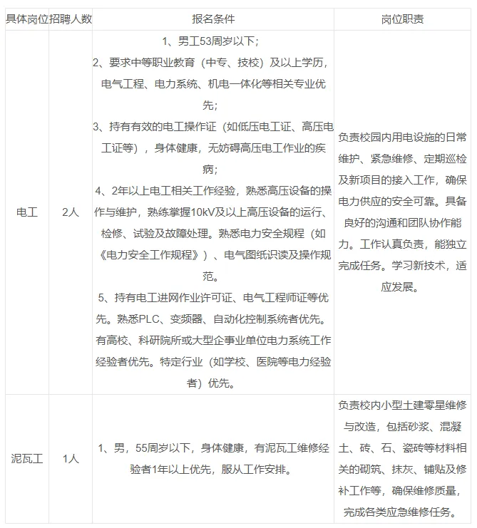因工作需要,河南君勤人力资源有限公司现面向社会公开诚聘电工2名、泥瓦工1名,派遣至安阳工学院后勤管理处工作。现将相关事宜公告如下: