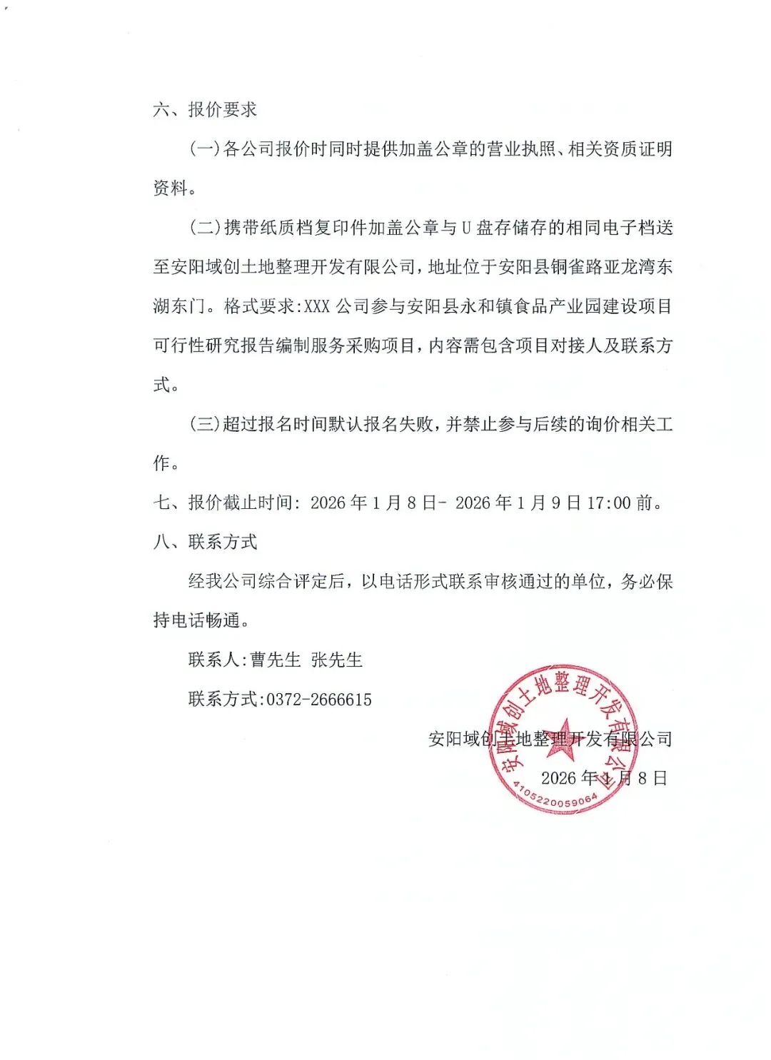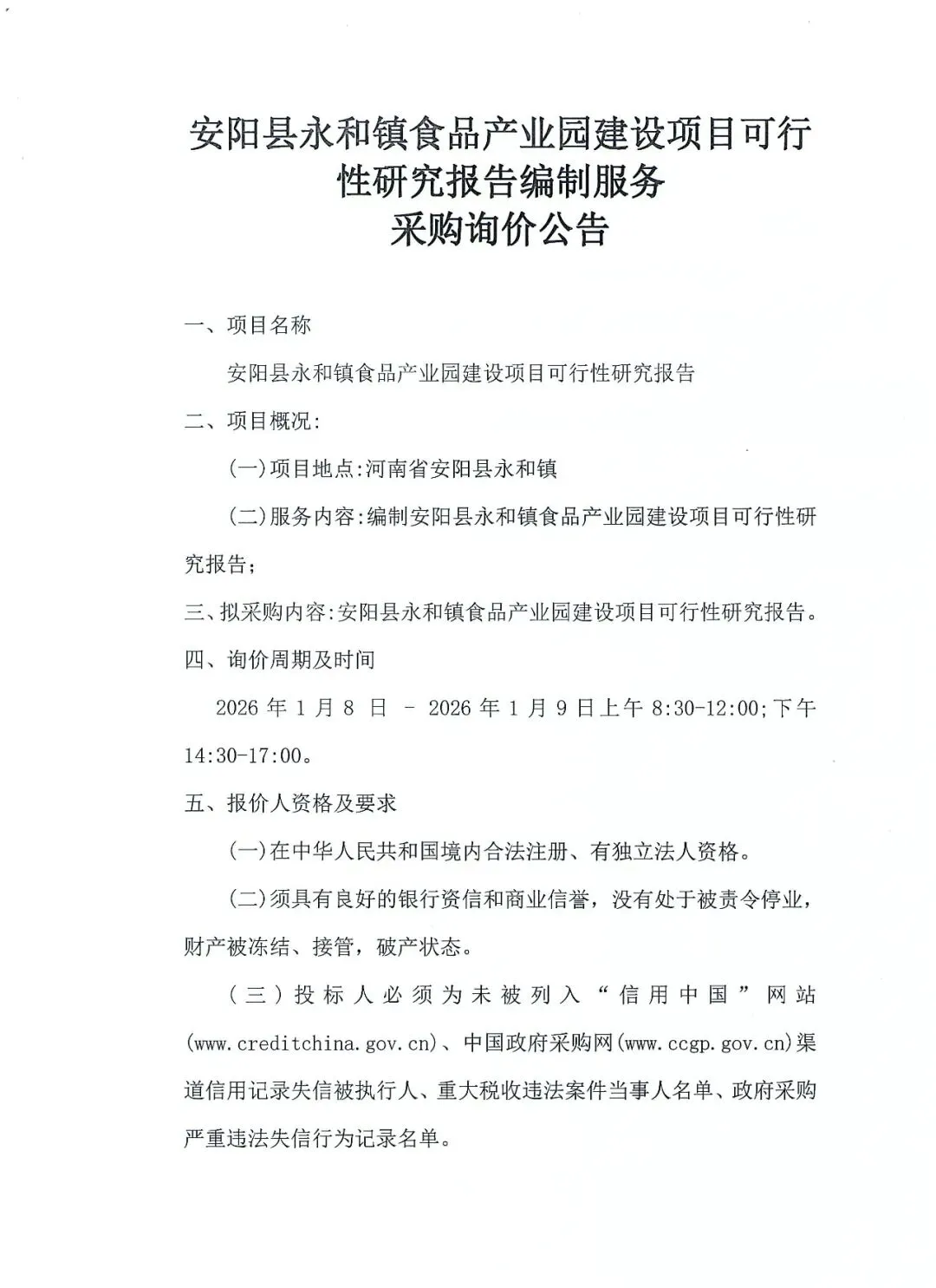 >安阳县永和镇食品产业园建设项目可行性研究报告编制服务采购询价公告
