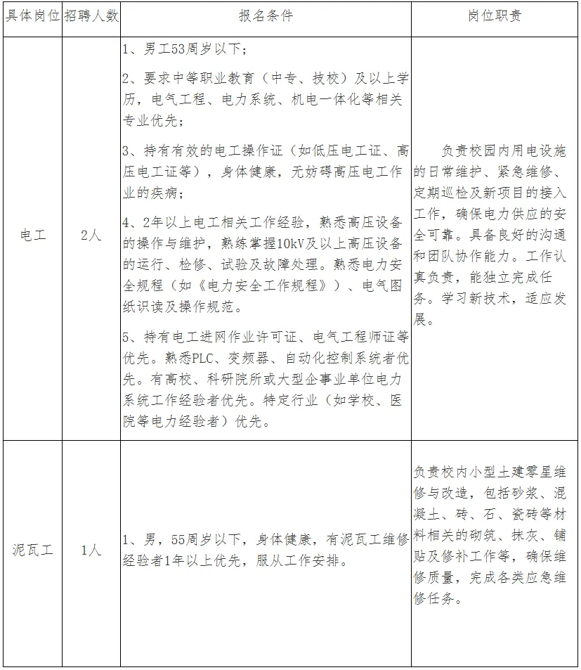 因工作需要,河南君勤人力资源有限公司现面向社会公开诚聘电工2名、泥瓦工1名,派遣至安阳工学院后勤管理处工作。现将相关事宜公告如下: