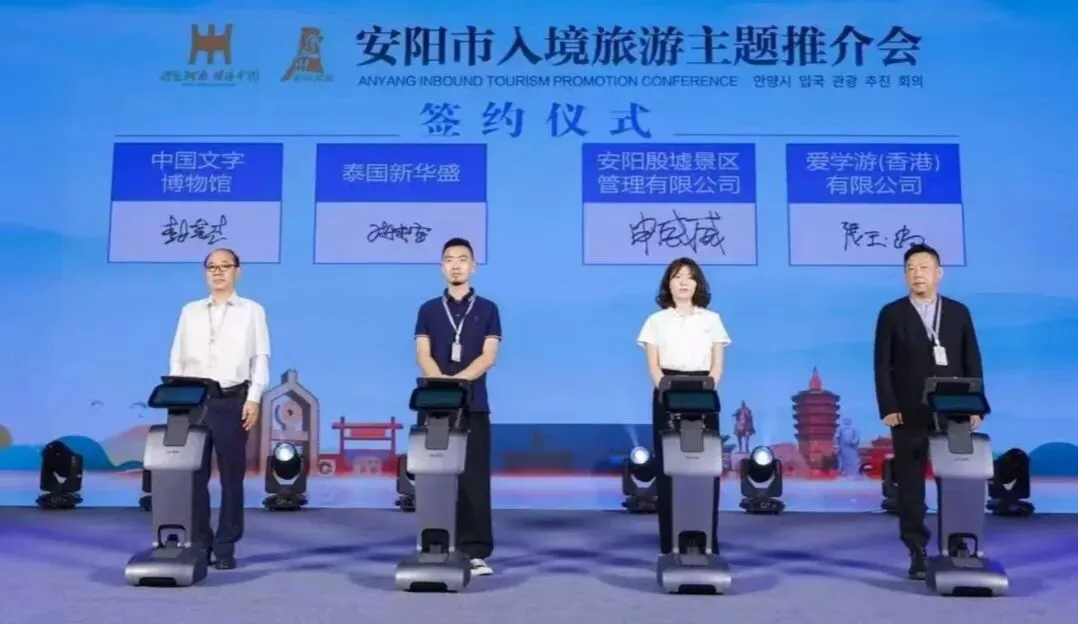 2025年7月17日下午,安阳市入境旅游主题推介会在林州市召开。会上发布了“汉字溯源·文明寻根”之旅、“山水诗画·运动休闲”之旅、“古都夜宴·烟火人间”之旅3条入境旅游精品线路。中国文字博物馆党委委员、副馆长韩英杰代表中国文字博物馆与泰国新华盛境外旅游机构现场签约。中国文字博物馆党委书记、常务副馆长宁红亮出席推介会。