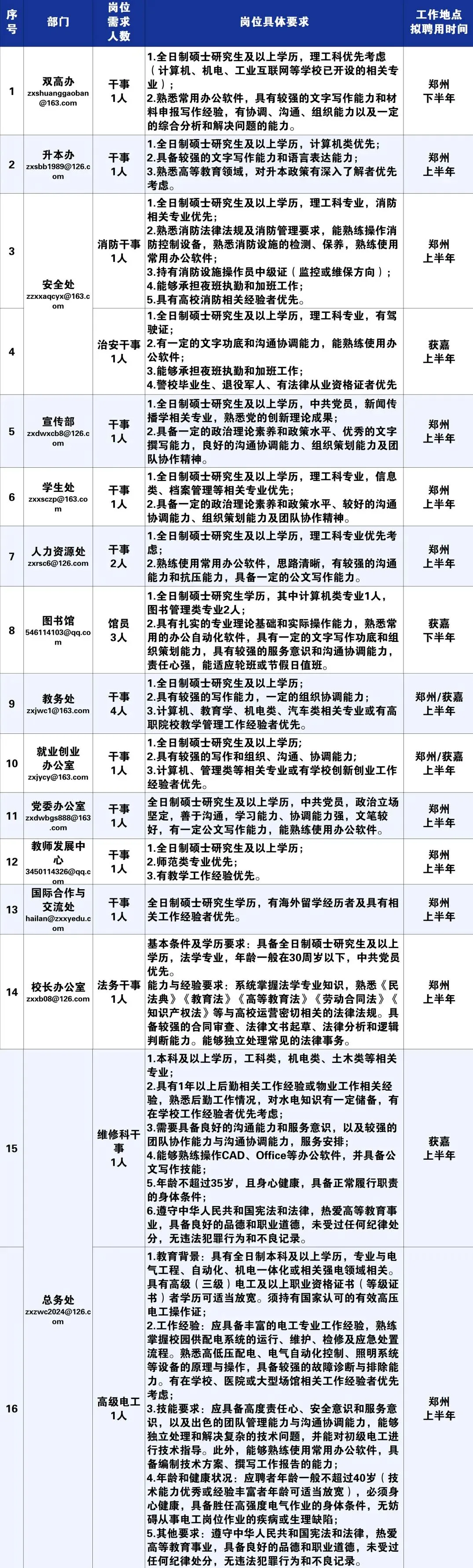 邮件标题请注明XX(应聘部门)—XX(应聘岗位)—XX(专业)—XX(学历)—XX(学校)—XX(姓名),如:信息学院—计算机网络教师—计算机科学与技术—硕士—郑州大学—张三。个人简历应包含学历、工作经历、政治面貌、家庭住址、所获荣誉、职称、科研成果、最快上岗时间等情况。有留学经历的人员,还需附上护照出入境记录页扫描件。