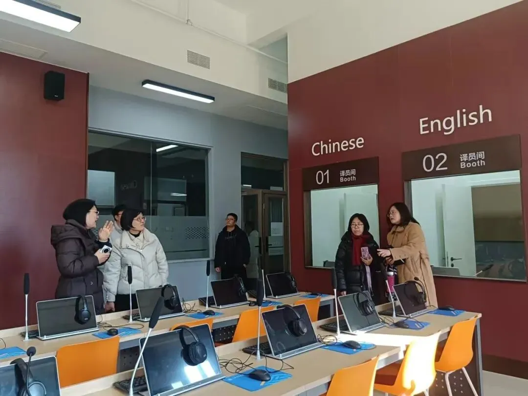在赵妤的陪同下,刘瑞娜一行实地参观考察了外国语学院“语通天下”文化体验中心、智慧听力口语实训室、智慧机辅翻译实训室、智慧阅读写作实训室、智慧商务外语综合实训室、国际商创中心及智慧外语同传实训室等实践教学场所,详细了解了各功能场室的教学应用与运行机制。