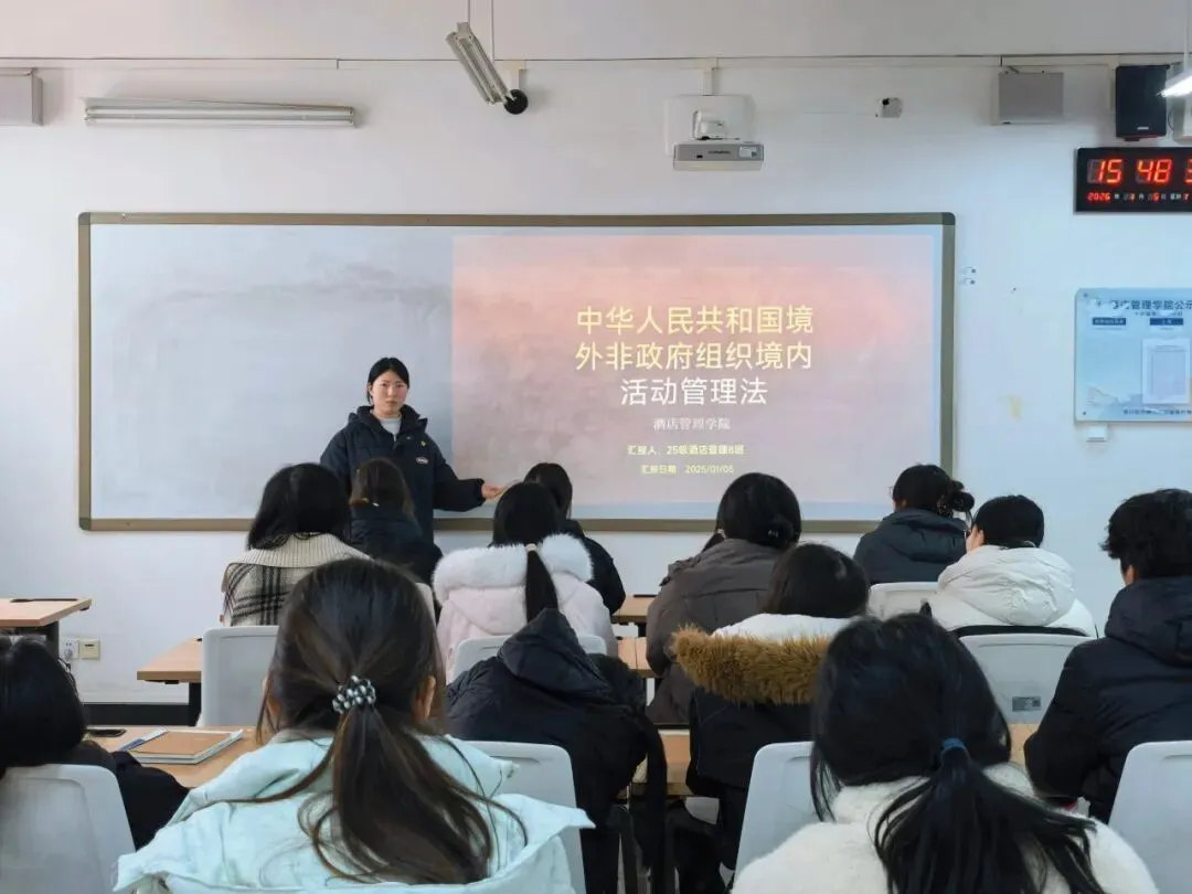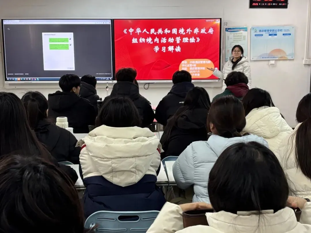 在班会中,老师们通过专题讲解、案例分析等多种形式,向同学们解读了《中华人民共和国境外非政府组织境内活动管理法》的立法背景、核心要义与实践要求。从境外非政府组织的定义、合法活动领域,到登记备案流程、禁止性规定,老师们用通俗易懂的语言拆解法律条文,重点强调了境外非政府组织在中国境内开展活动必须遵守中国法律,不得危害国家统一、安全和民族团结,不得从事营利性、政治性及非法宗教相关活动等关键内容。