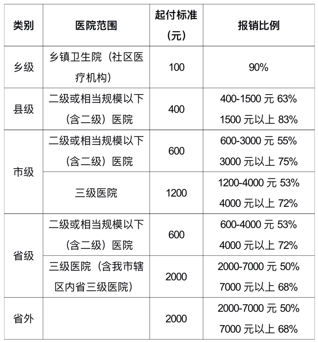 报销比例:在基层医院(乡镇卫生院、社区卫生服务中心、村卫生室)看病,报销60%。