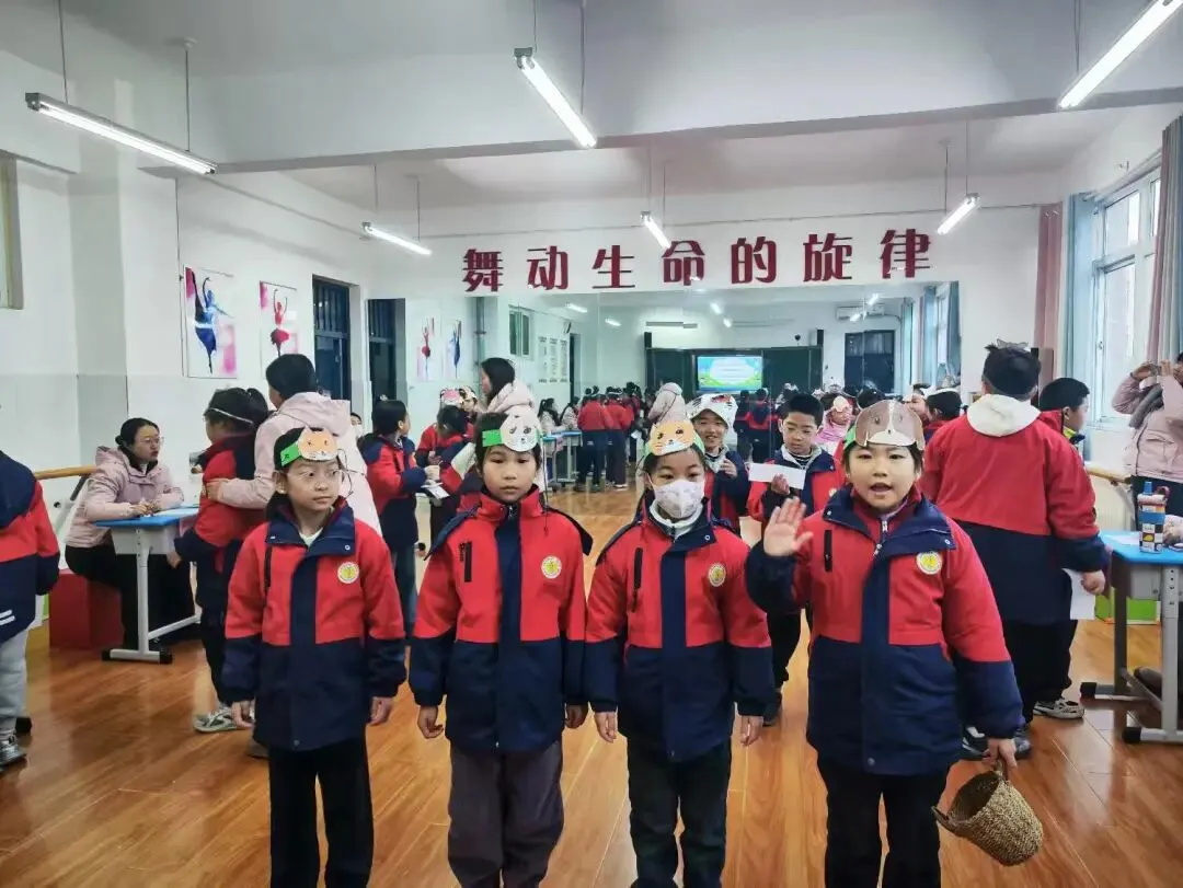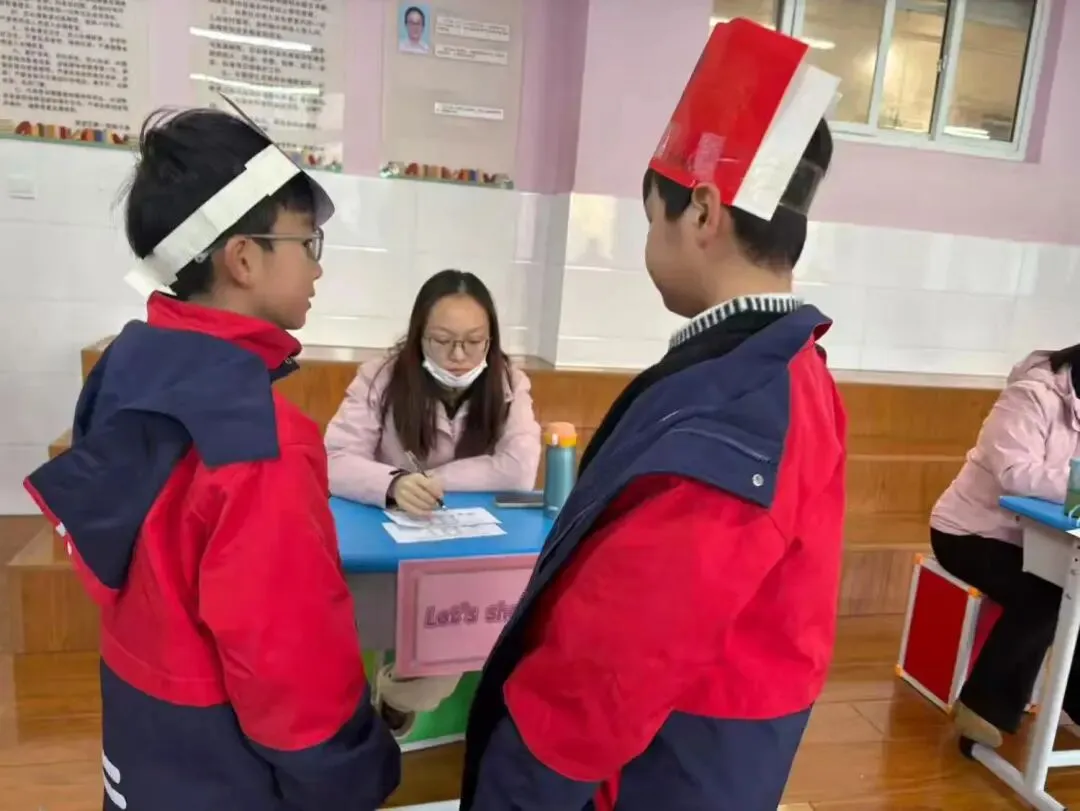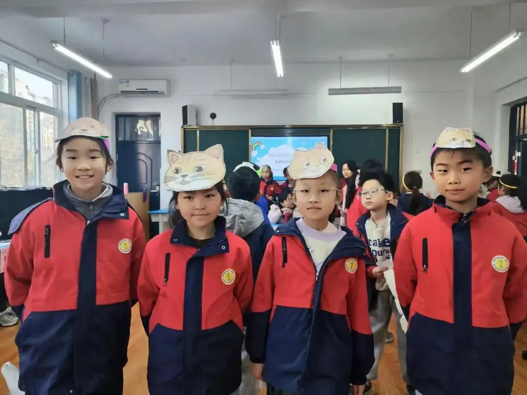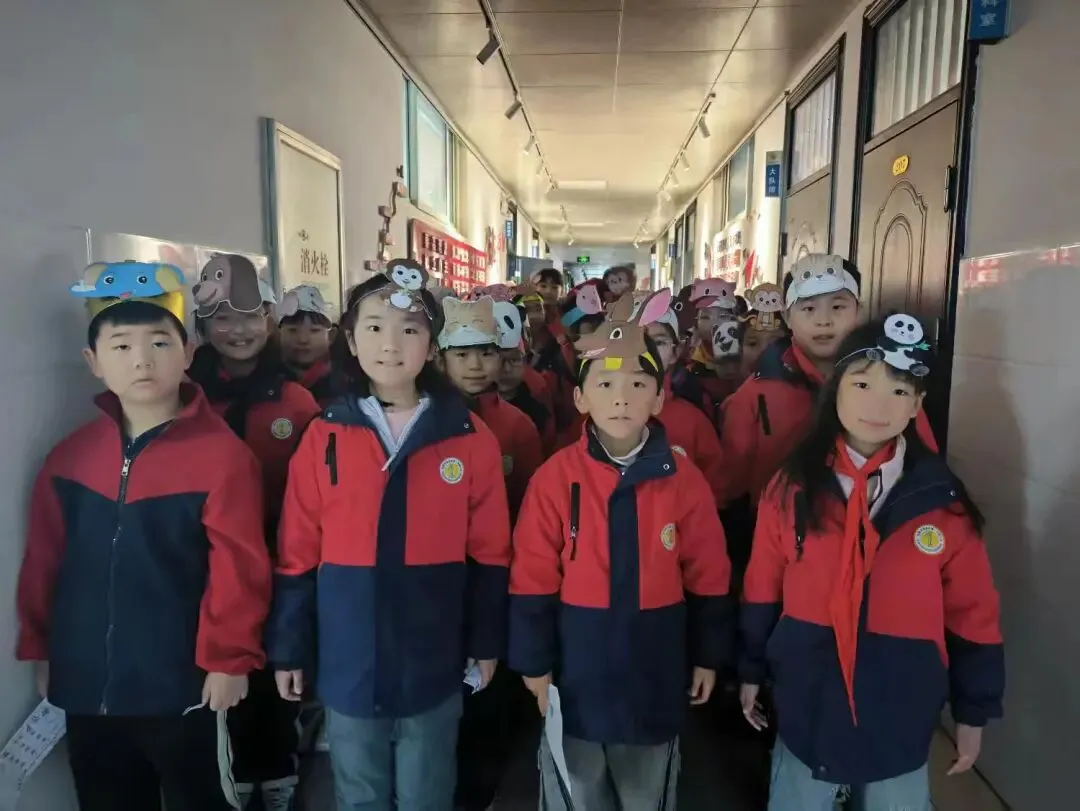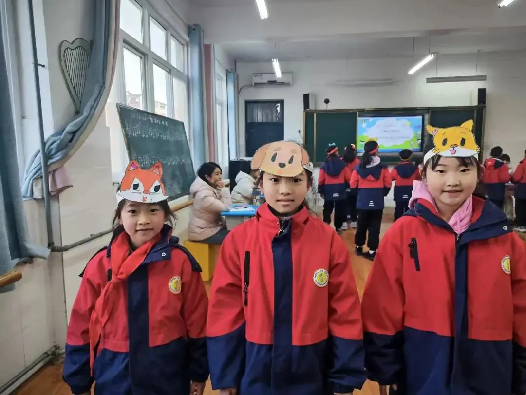 学生身着整洁校服,佩戴自制的动物头饰(如熊猫、小狗、小猪等),化身故事中的角色,用英语生动演绎对话场景,展现了扎实的语言基础和灵动的表达能力。