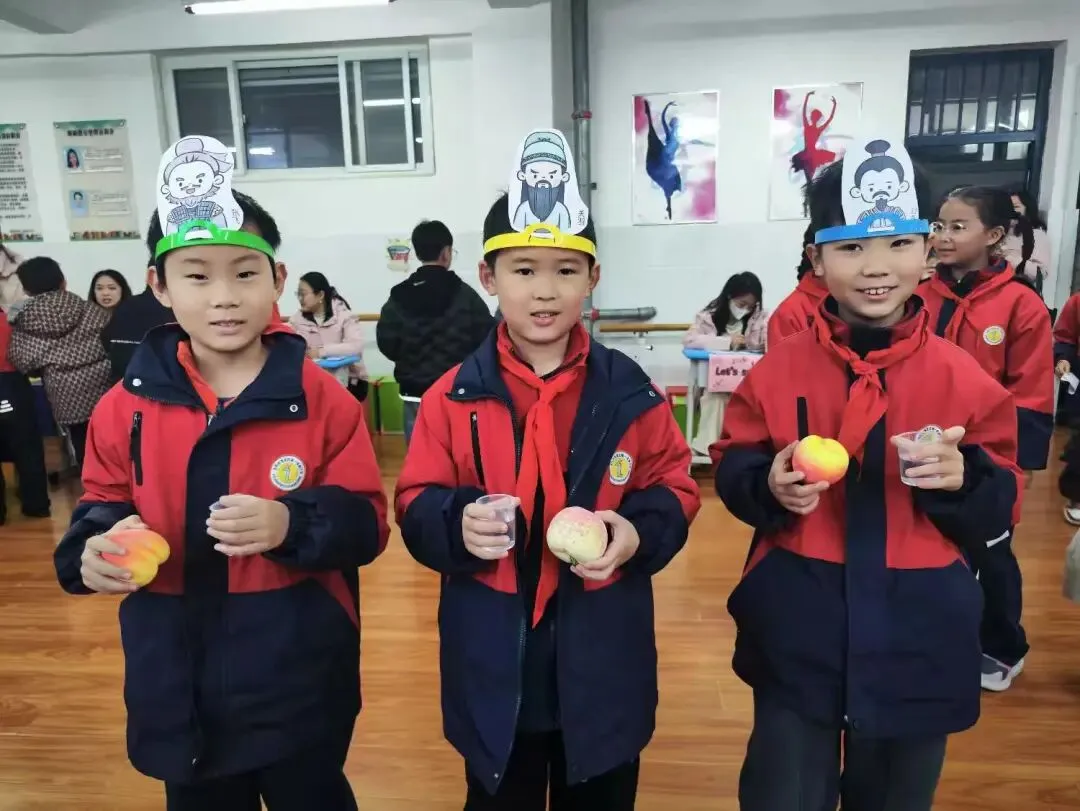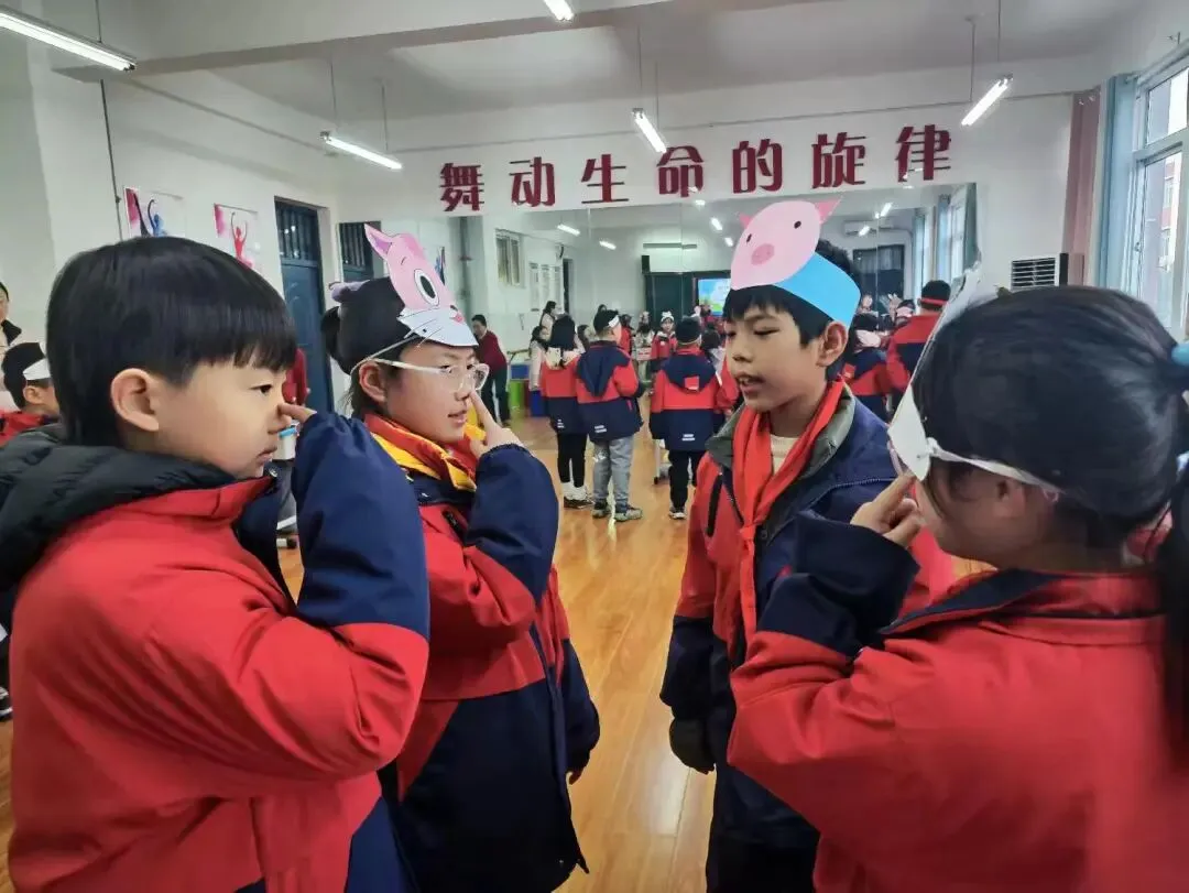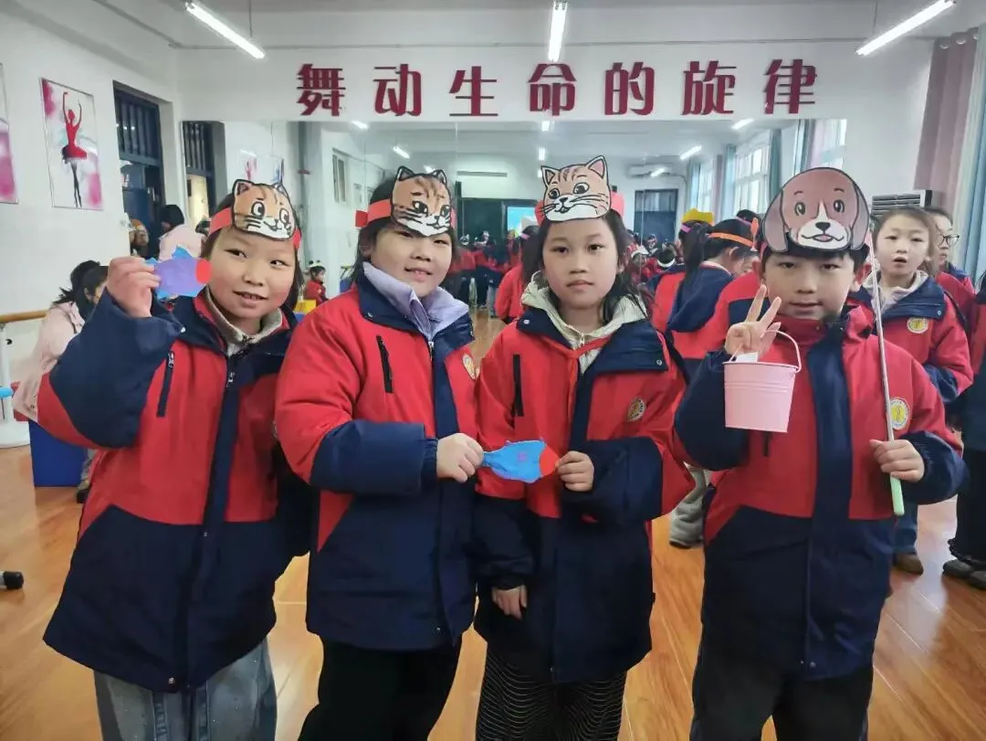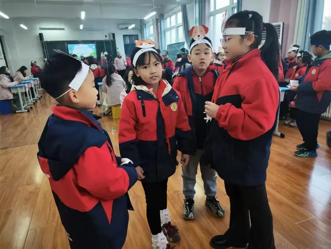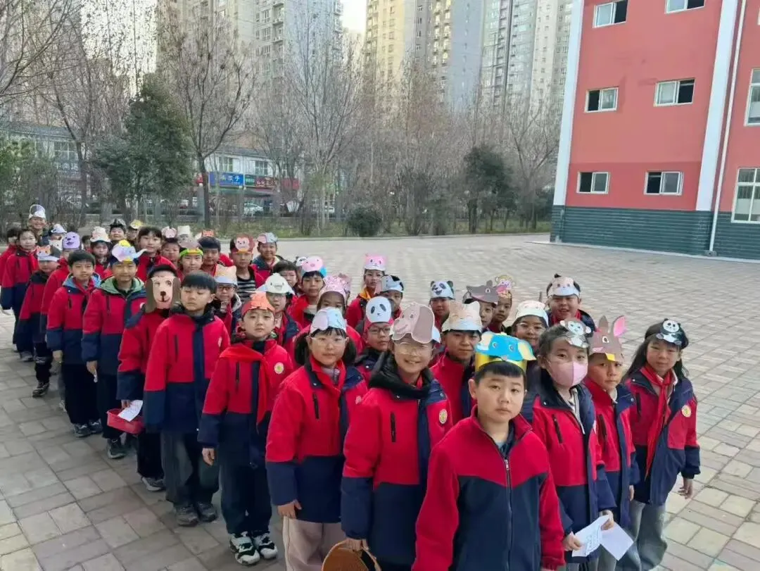 学生身着整洁校服,佩戴自制的动物头饰(如熊猫、小狗、小猪等),化身故事中的角色,用英语生动演绎对话场景,展现了扎实的语言基础和灵动的表达能力。