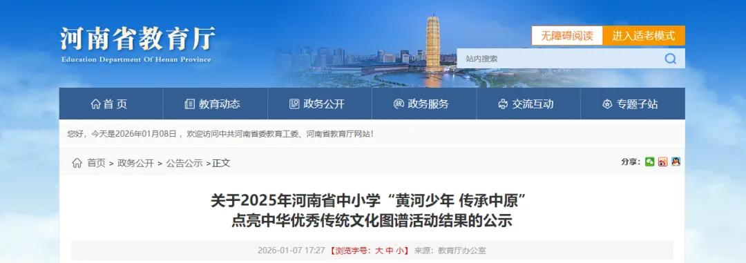 根据《河南省教育厅关于印发<河南省中小学中华优秀传统文化传承发展工程实施方案>的通知》(教基〔2022〕159号)、《河南省教育厅办公室关于在全省中小学校开展“黄河少年 传承中原”点亮中华优秀传统文化图谱活动的通知》(教办基〔2025〕258号)等文件要求,省教育厅于2025年在全省中小学校开展了“黄河少年 传承中原”点亮中华优秀传统文化图谱活动。经各地推荐、省级遴选,最终选出典型案例87个。现将结果予以公示。