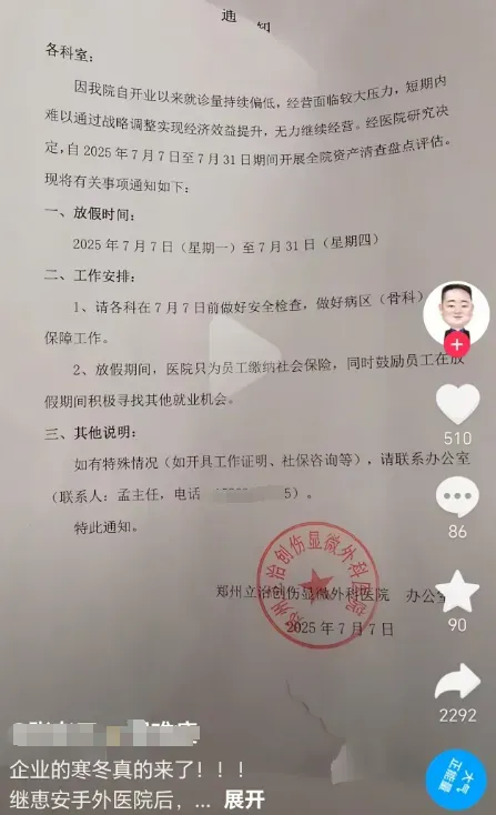通知声称:因医院自开业以来就诊量持续偏低,经营面临较大压力,短期内难以通过战略调整实现经济效益提升,无力继续经营。经医院研究决定,自2025年7月7日至7月31日期间开展全院资产清查盘点评估。现将有关事项通知如下: