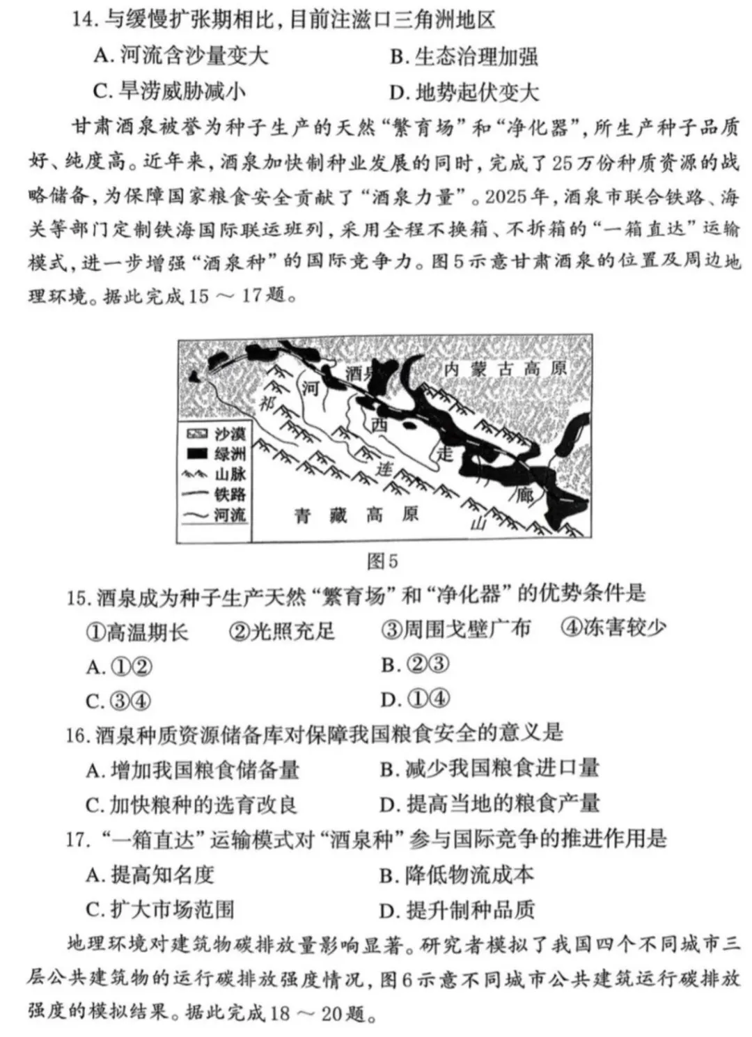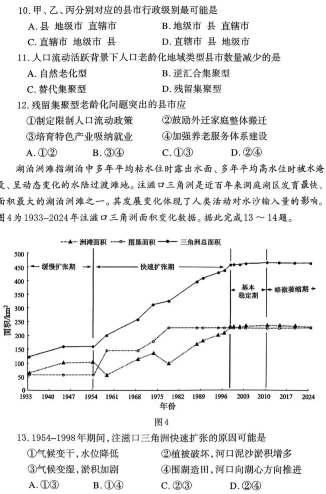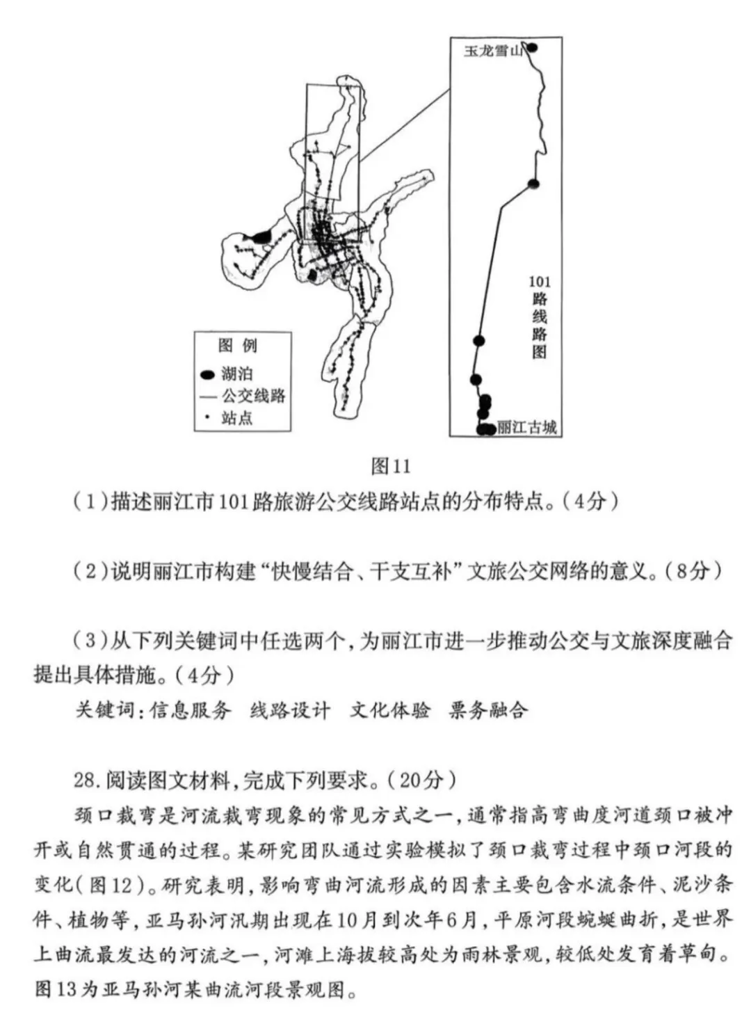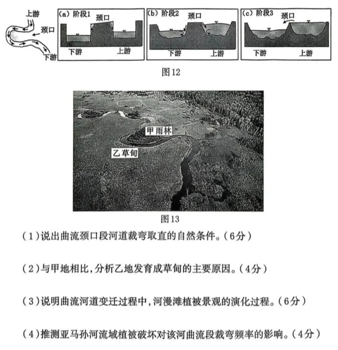 (1)地形平坦;河道弯曲,凹岸侵蚀;水量大;河岸物质松软。(任答 3 点得 6 分)(2)仅能在枯水期满足草本植物生长,形成草甸。(2 分)(3)新形成的河漫滩上,少量耐水淹的(先锋)草本植物在枯水期生长,形成草甸植被;(2 分)随着泥沙沉积,海拔较高的河漫滩地,会有更多种类植物在此生长,土壤养分、水分条件逐步改善,(2 分)乔木发育,形成雨林景观。(2 分)总体呈现草甸、雨林并存的植被景观。(4)植被破坏,保持水土能力下降,颈口河岸冲刷速率加快;(2 分)减小裁弯所需流量,缩短裁弯所需时间,裁弯频率增加。(2 分)
