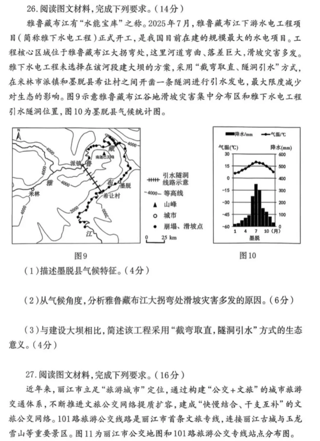 (1)墨脱县全年温和,年温差较小;降水充沛,主要集中在夏季(6-8 月);气候垂直差异显著。(任答 2 点得 4 分)(2)受西南季风影响,夏季降水集中且强度大,坡面侵蚀强烈,易引发滑坡;(2 分)高原地区温差较大,风化作用强,岩石疏松破碎;(2 分)高海拔地区气温较低,冰川广布,反复冻融破坏岩体并诱发滑坡。(2 分)(3)避开断裂带、陡坡及滑坡密集区,减少大坝蓄水对岩层的压力,减轻滑坡、地震等地质灾害带的生态破坏;减小淹没范围,最大限度保留原始生态系统,减少对地表植被破坏;为鱼类等水生生物保留天然河道,降低对生物栖息地的破坏。(任答 2 点得 4 分)