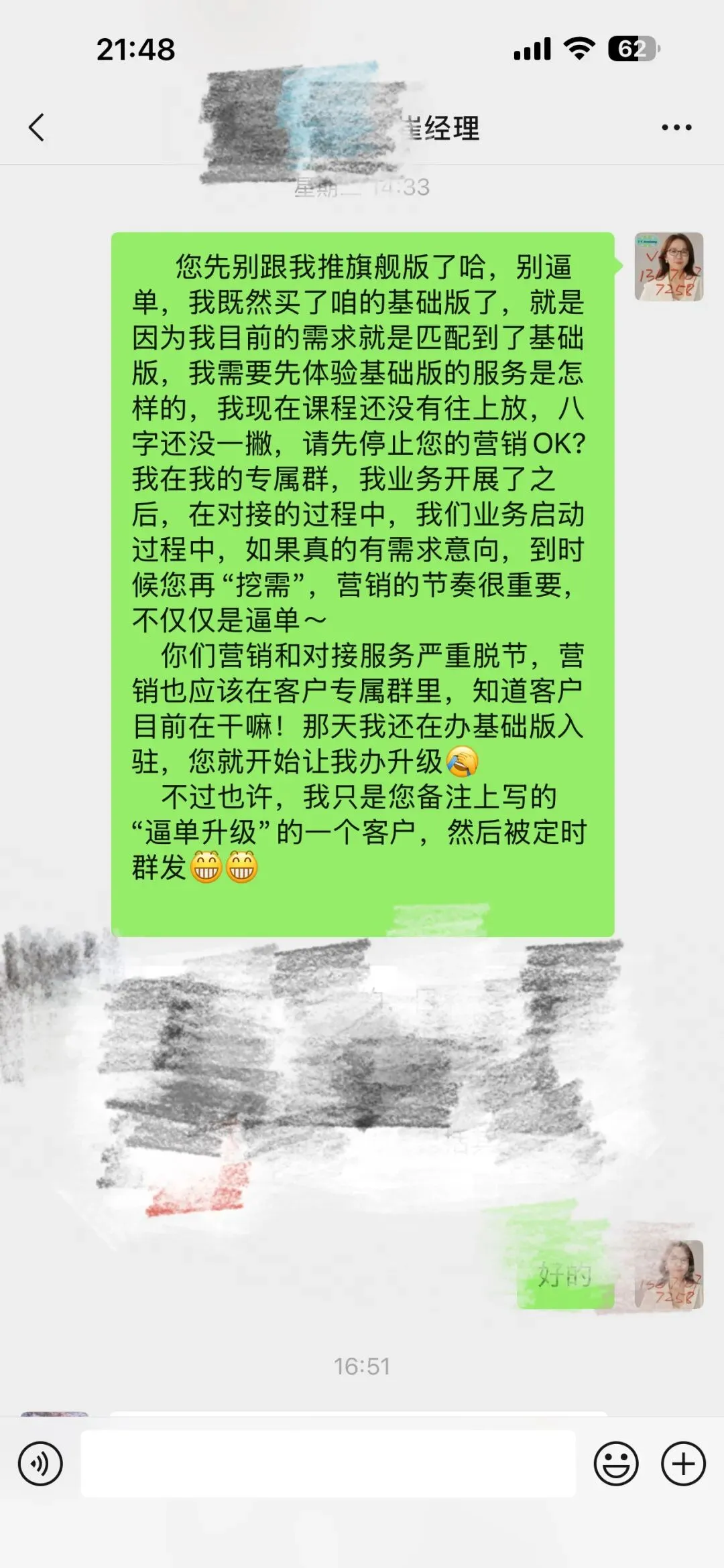 好巧不巧,他们平台的逼单我成功的销售那时那刻给我打电话,又要逼单我升级套餐!