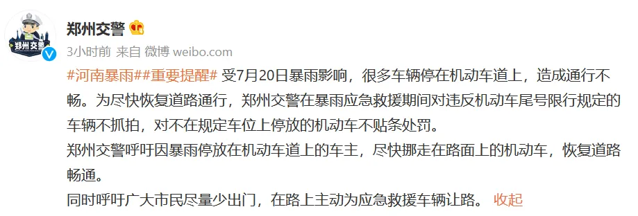 据郑州交警官方微博消息:受7月20日暴雨影响,很多车辆停在机动车道上,造成通行不畅。为尽快恢复道路通行,郑州交警在暴雨应急救援期间对违反机动车尾号限行规定的车辆不抓拍,对不在规定车位上停放的机动车不贴条处罚。