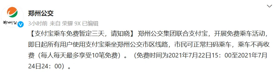 郑州公交集团联合支付宝,开展免费乘车活动,即日起所有用户使用支付宝乘坐郑州公交市区线路,市民可正常扫码乘车,乘车不再收费(每人每天最多享受10笔免费),免费时间为2021年7月22日15:00至2021年7月24日24:00)。