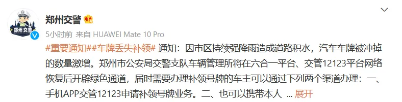 据郑州交警官方微博消息:因市区持续强降雨造成道路积水,汽车车牌被冲掉的数量激增。郑州市公安局交警支队车辆管理所将在六合一平台、交管12123平台网络恢复后开辟绿色通道,届时需要办理补领号牌的车主可以通过下列两个渠道办理:
