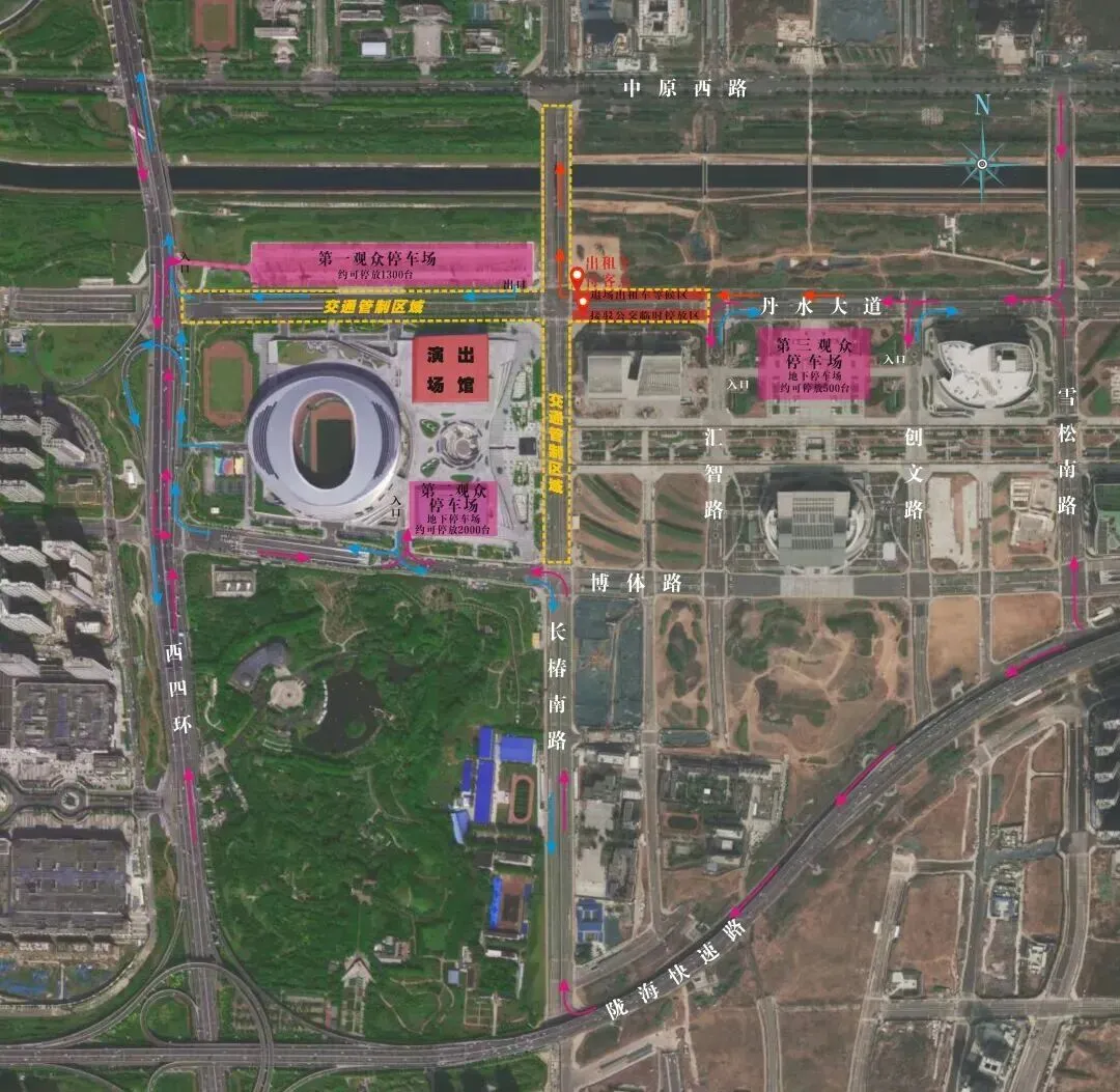 设在郑州CCD PARK地下停车场。观众车辆沿雪松南路——丹水大道(向西)——分别在创文路和汇智路驶入停车场——进入地下停车场停放(丹水大道与汇智路交叉口以西禁止观众车辆通行);退场时,车辆驶出停车场出口后——经丹水大道向东驶离活动现场。请扫描下方二维码导航前往停车场。该停车场饱和后,请根据交警及工作人员指挥或导航提示,前往其他停车场停放。