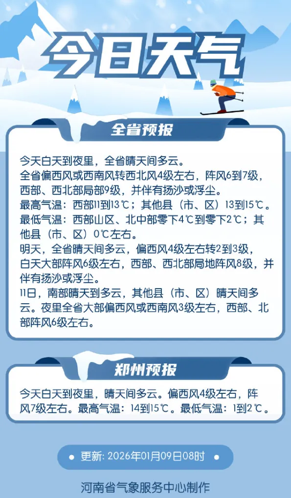 郑州市气象台2026年01月09日07时07分发布大风蓝色预警信号:预计今天白天到夜里,郑州市惠济区、上街区所辖乡镇及街道有4级左右偏西风,阵风7级左右,局地8级以上。请注意防范大风天气带来的不利影响。