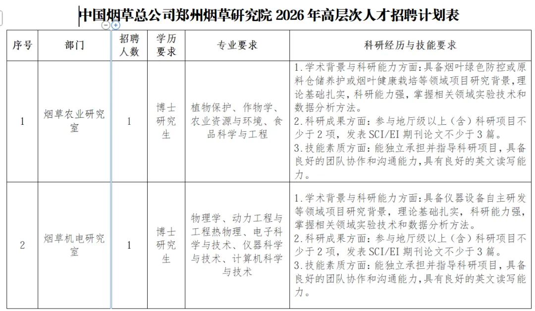 本次计划公开招聘2人,具体岗位和专业要求详见《中国烟草总公司郑州烟草研究院2026年高层次人才招聘计划表》(附件1)。