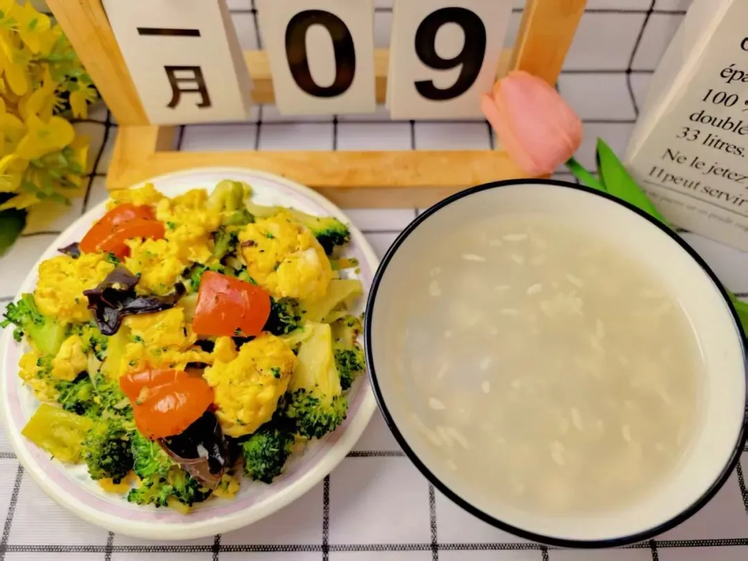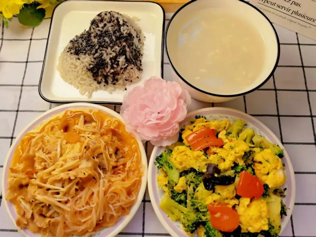 黑芝麻米饭、金针肥牛、西蓝花炒鸡蛋、米酒汤圆