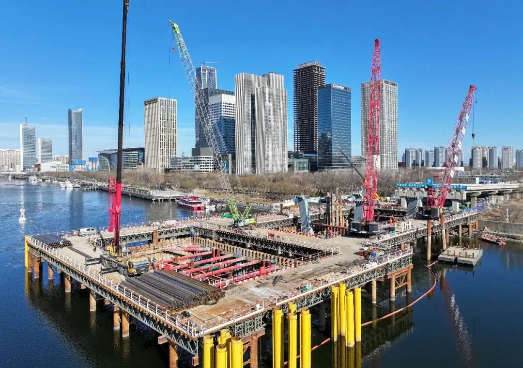 于新桥项目海河上单个平面尺寸2200余平方米、开挖深度超18米,超大型锁扣钢管桩围堰施工难度高。