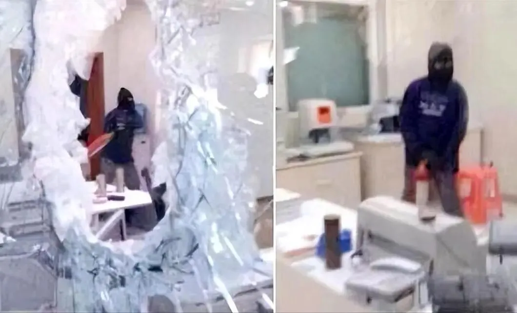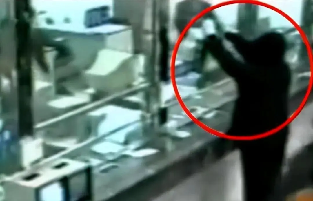 随后,蒙面男子拿出提前准备好的铁锤,对着防弹玻璃进行一顿猛砸,终于把防弹玻璃砸开。
