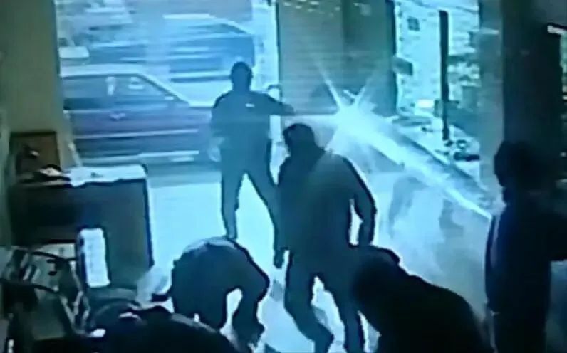 见此情景,正在广发银行办理业务的几个客户似乎感觉到了危险,于是马上跑了出去。