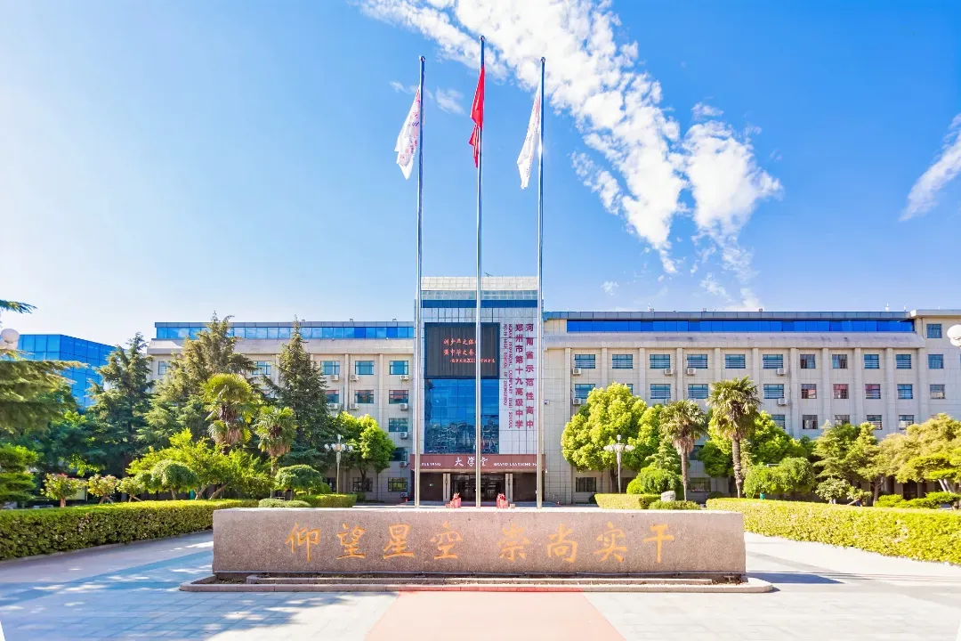 郑州市第十九高级中学创办于1956年,原名为“河南省郑州第一中学”,是解放后市政府创办的第一所完全中学。2007年8月,高中部搬入二七区陇海中路76号,2019年12月,按照市委市政府基础教育分级管理的政策,高中部保留为市教育局直属单设高中,命名为“郑州市第十九高级中学”。这所七十年薪火相传的名校,传承着长期以来形成的厚重的文化底蕴,始终坚持“五育并举”,培养出了一批又一批德智体美劳全面发展的人才。学校荣获国家级绿色学校、全国平安和谐校园、全国首届中小学校园文化建设百佳创新学校、全国首批校园足球示范学校、全国学校文化建设金奖单位、河南省示范性高中、河南省文明校园标兵单位、河南省德育工作先进集体等多项荣誉称号。