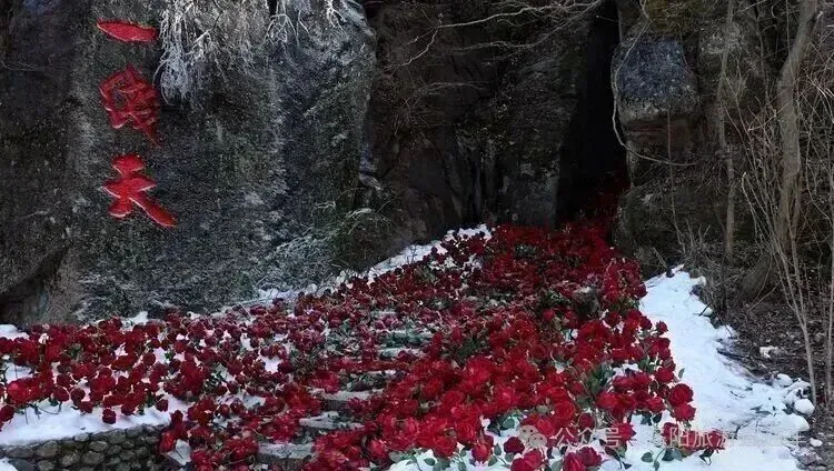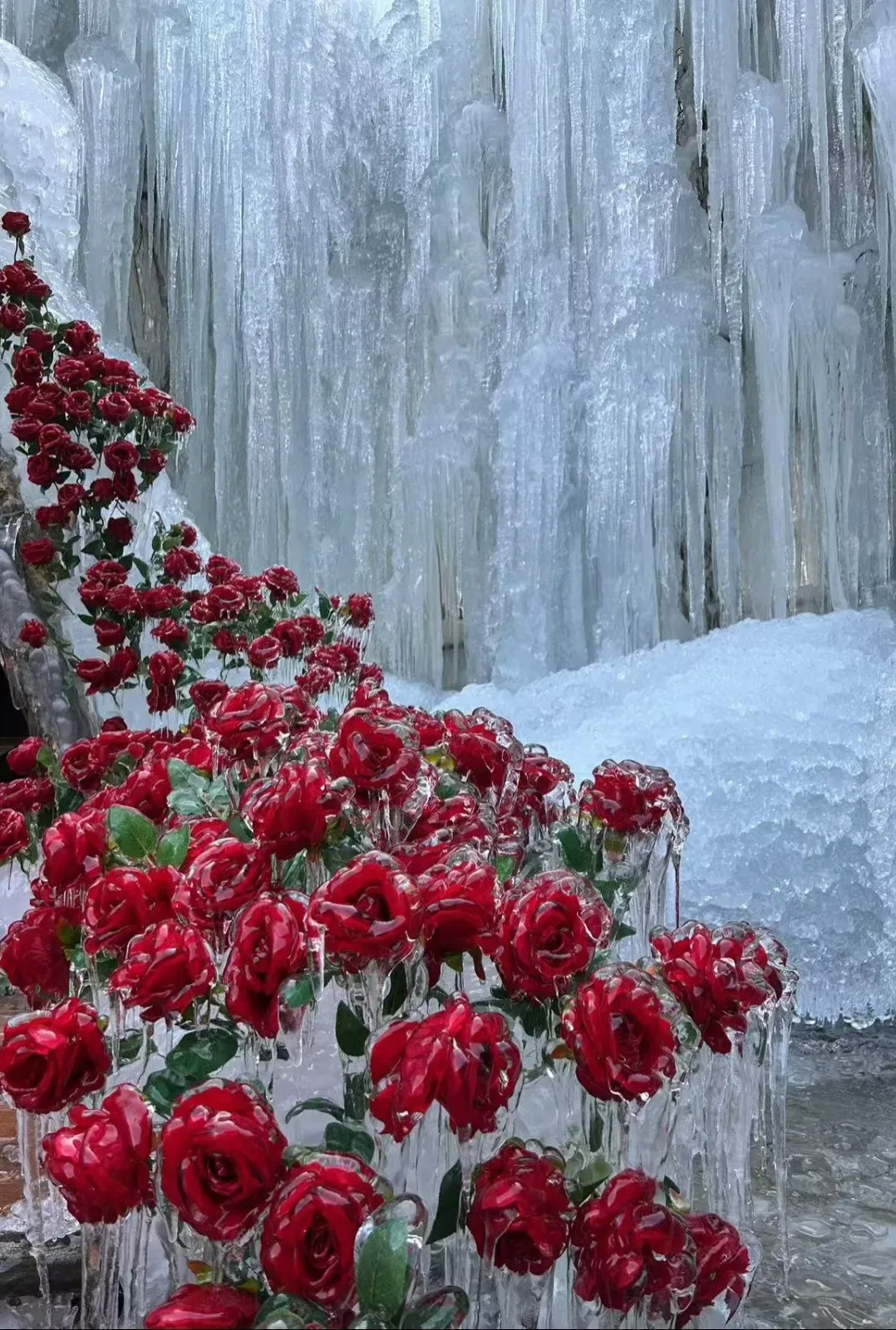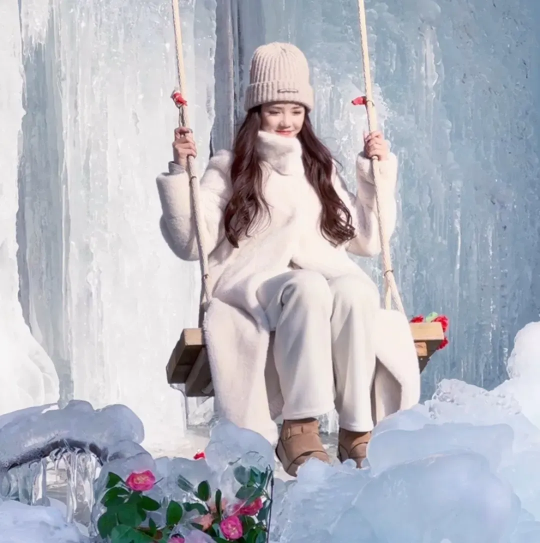 绵延近三公里的冰挂群,同时融入了冰封玫瑰、玫瑰花屋、网红秋千等众多打卡元素。冰雪交融的峡谷里,随手一拍就是美景。