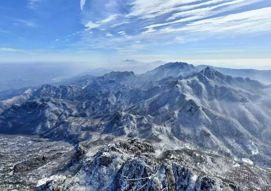 景区里山峦通体洁白,似披上银甲,峰尖直插云霄,于蓝天映衬下,仿若仙境圣境。