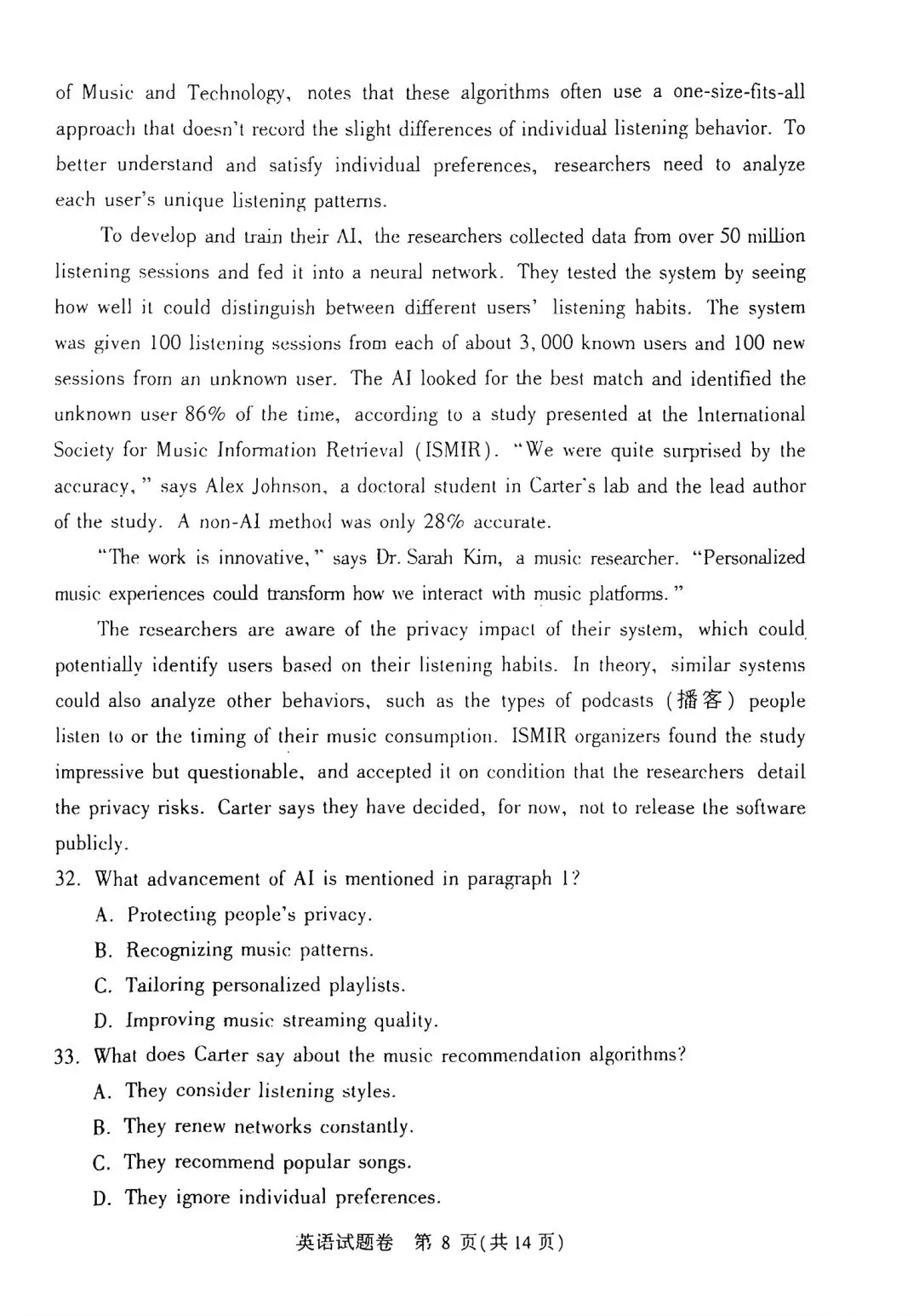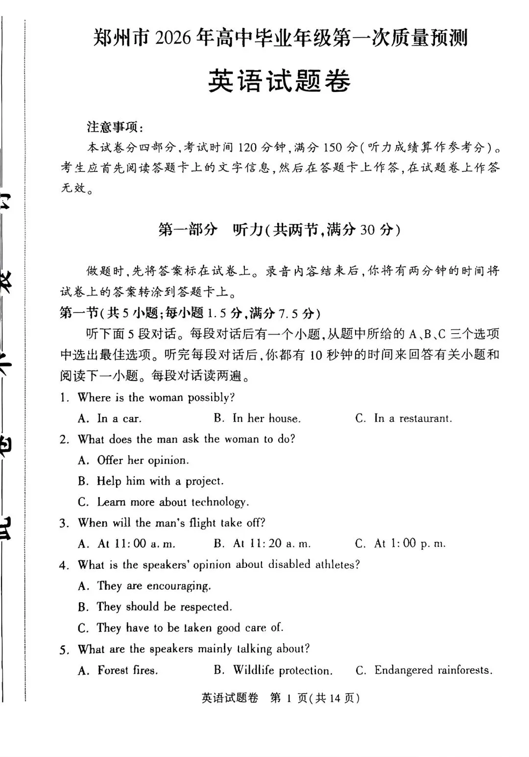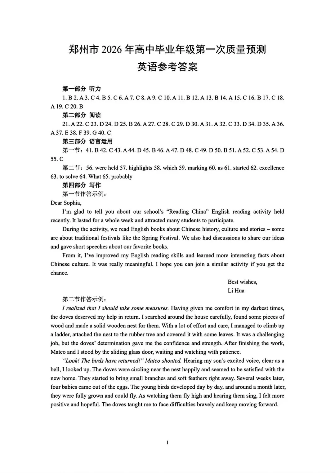 >郑州市2026年高中毕业年级第一次质量预测英语试题卷带答案