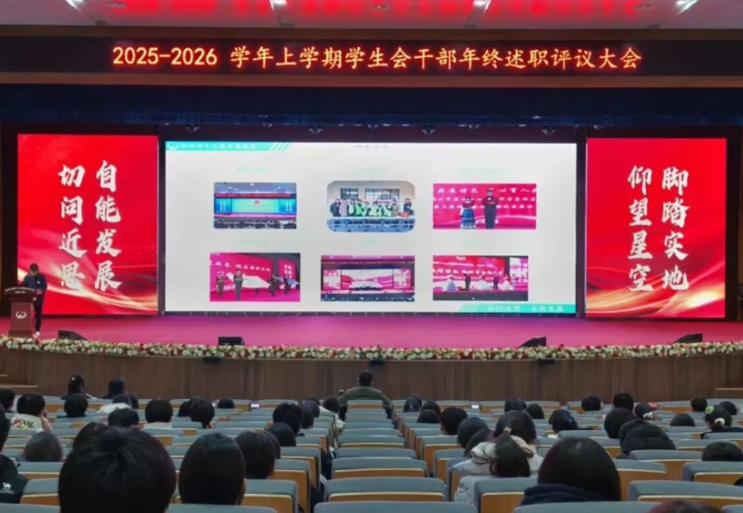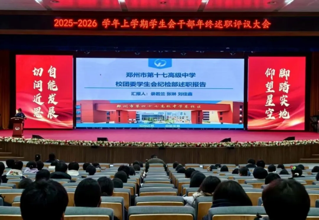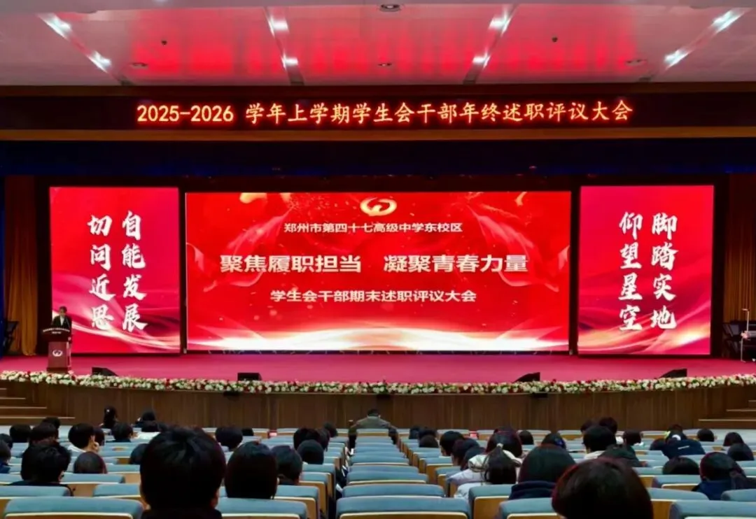 时光荏苒,初心不改。为全面总结2025-2026学年度上学期学生会工作成效,增强学生干部的责任意识与团队凝聚力,郑州市第四十七高级中学东校区校学生会干部期末述职评议活动在闻道堂顺利举行。