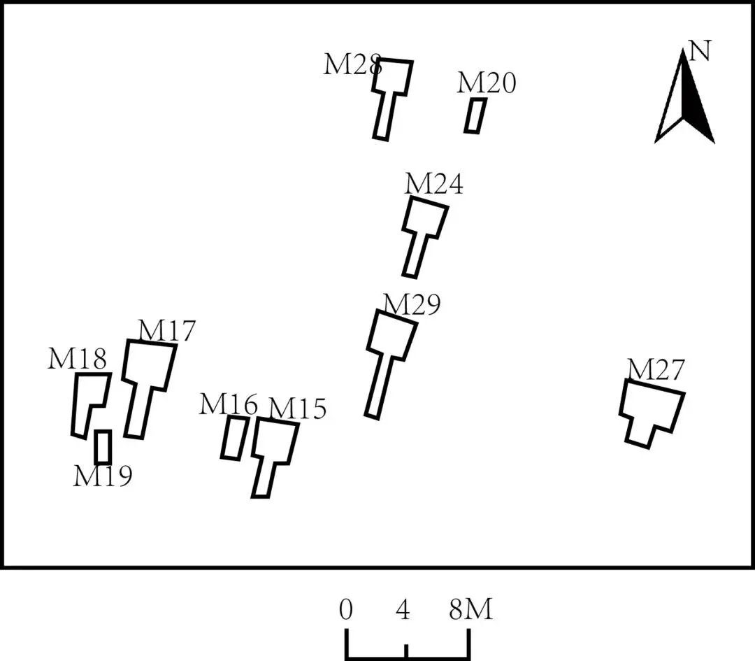 M2 形制为“甲”字形单墓道砖室墓,如图八所示,墓向为南,室顶部遭到破坏已残损,仅余墓壁的23层砖,墓道为短斜坡式,墓门遭到破坏未见残留,墓室内遭到盗扰,人骨移位严重。