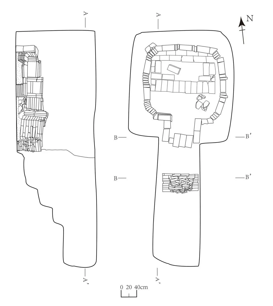此次发掘共清理出人骨2具,葬式均为仰身直肢,头向均为西向。经体质人类学鉴定两具人骨分别为男性,45-50岁;女性,40岁左右,其中北侧的男性人骨移位较少且未见缺失,应为一次葬,南侧的女性人骨由于遭到盗扰,缺失、移位较多,但尚无法判明是埋葬时形成抑或后期破坏扰乱所致。
