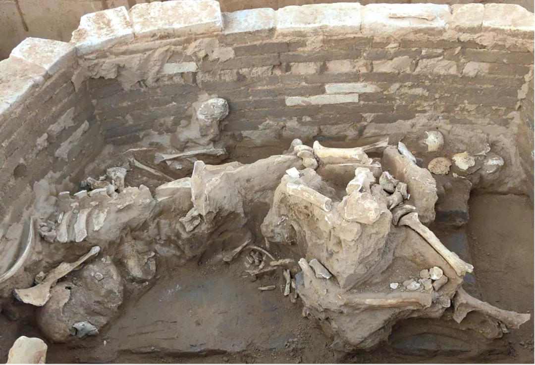 殉牛2具,为墓室内放置,如图八所示,两具殉牛分布于墓室西北-东南的对角线,头向相反,根据后期拼对二者均为完整体。西侧牛骨头向西北,面向北,然其肋骨与牛首间隔较远,未见连接。东侧牛骨分布较为集中,牛首向东南,面向下,根据摆放姿态,胫骨与股骨不见连接且分置较远,另叠压于肋骨之上,整体骨骼均未见连接,极其散断,应是分解后堆放所致。其下有一层青砖,用以间隔下层人骨,因此可以推论为墓主埋葬后将散乱牛骨摊置。