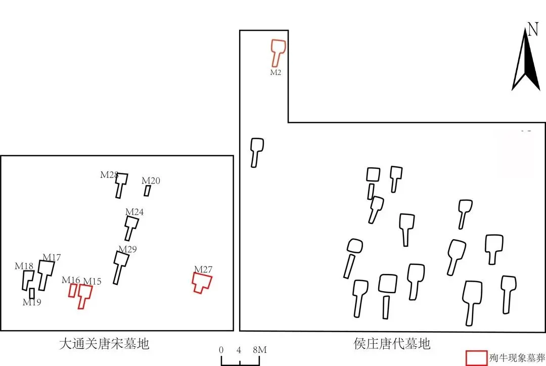 通过对大通关遗址墓地与侯庄唐代墓地殉牛墓葬在墓地中的分布位置分析,可以初步得出少数民族在中原地区经过迁居、生产生活后已经融入当地汉民族群体中,因而呈现出共处一片墓地的现象。但是3座墓葬的位置均分布在2处墓地的相对边缘位置,如图一〇所示,保持相对独立的区域,由此或可推测,少数民族在与中原汉民族群体融合中接受了汉文化的改革,但是深层次意识形态仍保持一定的顽固性与滞后性,结合墓葬内殉牛的葬俗,更加使这一认识得到深化和证实。