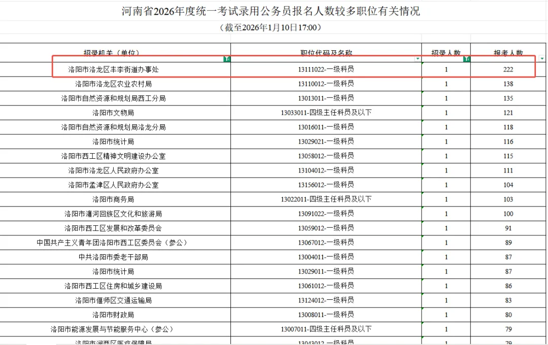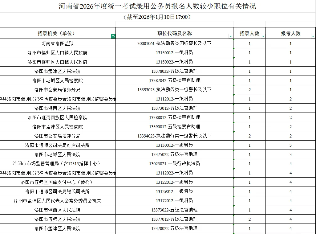 洛阳目前还有这些岗位报名人数未到五人。部分岗位甚至还没有到开考比例。快看看这些有你心仪的岗位吗,如果有的话可以持续关注哦。