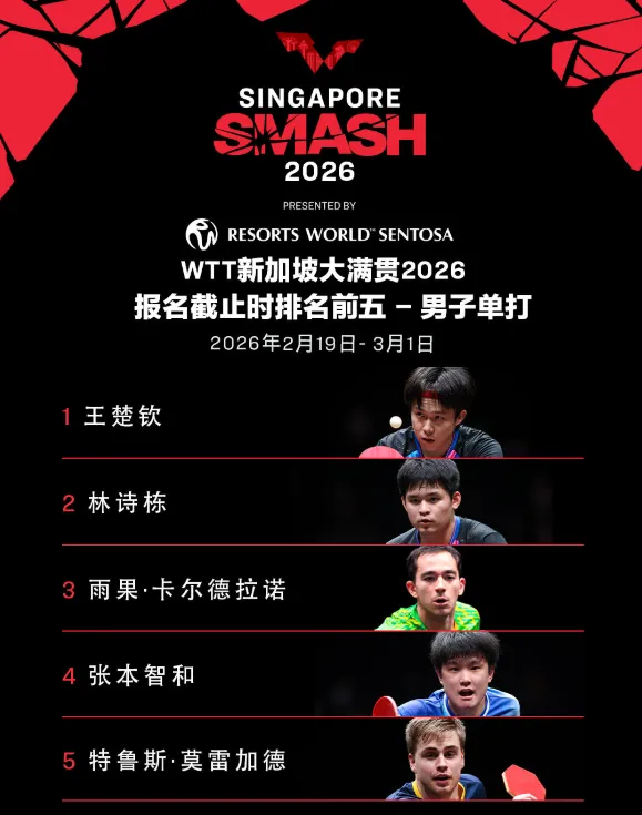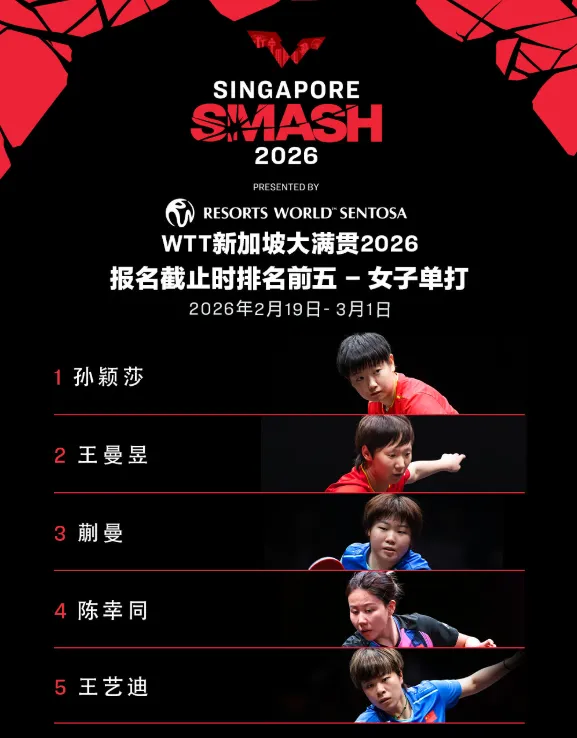 WTT新加坡大满贯2026将于2月19日至3月1日在新加坡体育中心举行。WTT世界乒联公布首批参赛名单。男单方面,王楚钦、林诗栋等出战;女单方面,孙颖莎、王曼昱、蒯曼、陈幸同、王艺迪等参赛。