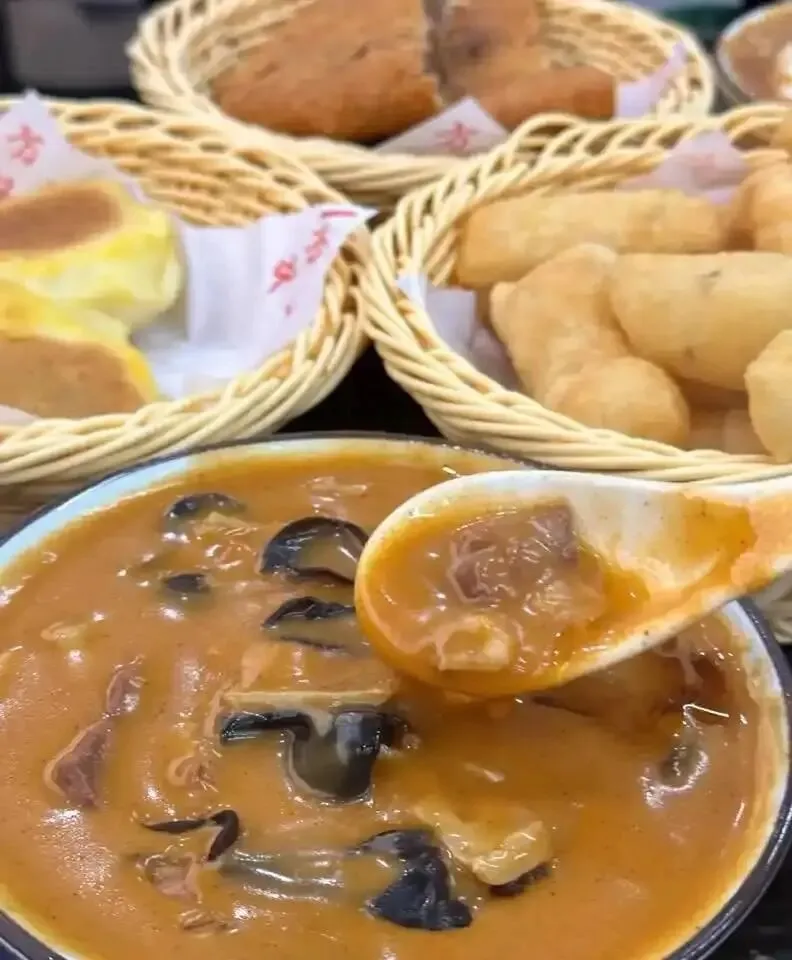 提到郑州早餐,方中山胡辣汤是绕不开的名字。 这碗汤是“嗜辣星人的晨起狂欢”,精髓在于“浓、麻、辣、鲜”四字。 汤底用牛骨、羊骨慢熬至醇厚浓稠,加入面筋、木耳、海带、牛肉丁等丰富配料,再以足量花椒、辣椒调味,汤色红亮,香气霸道。