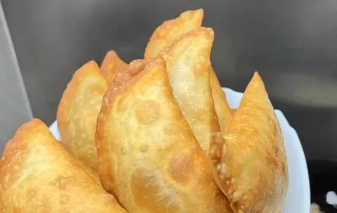 菜角是郑州早餐摊的“常青款”,也是河南人节庆必备的小吃。 外皮用烫面制作,揉得软韧有筋性,包入切碎的韭菜、粉丝、鸡蛋碎,捏成半月形的花边,入热油炸至金黄酥脆。 刚出锅的菜角热气腾腾,外皮酥脆掉渣,内馅鲜香多汁。