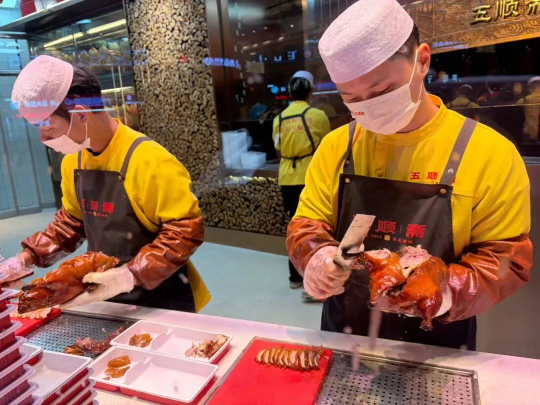 烤鸭是柴火烤的,环境干净清爽,店门口顾客络绎不绝。