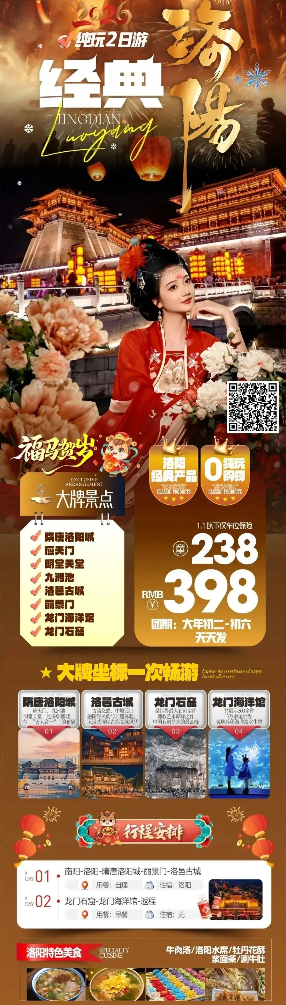 隋唐洛阳城:天堂明堂/九洲池/应天门三大景区联票景区挂牌价180元,满10人起旅行社优惠价120元(费用自愿自理)隋唐洛阳城国家遗址公园曾是隋、唐、五代和宋代宫城遗址的核心区域,其中出名的是武则天时期的明堂和天堂,2013年徐克导演的电影《狄仁杰之通天帝国》中的通天浮屠的原型就在这里。