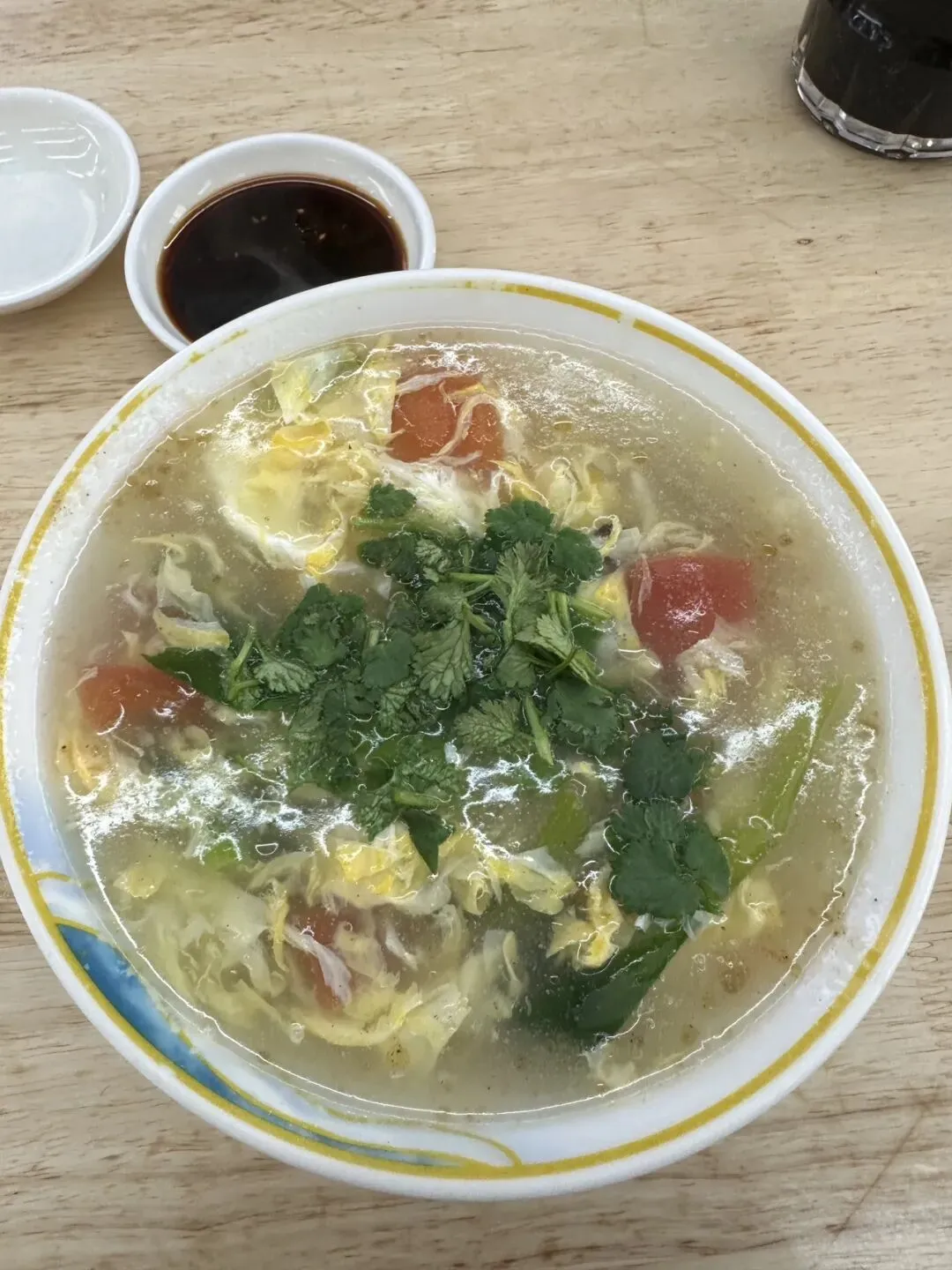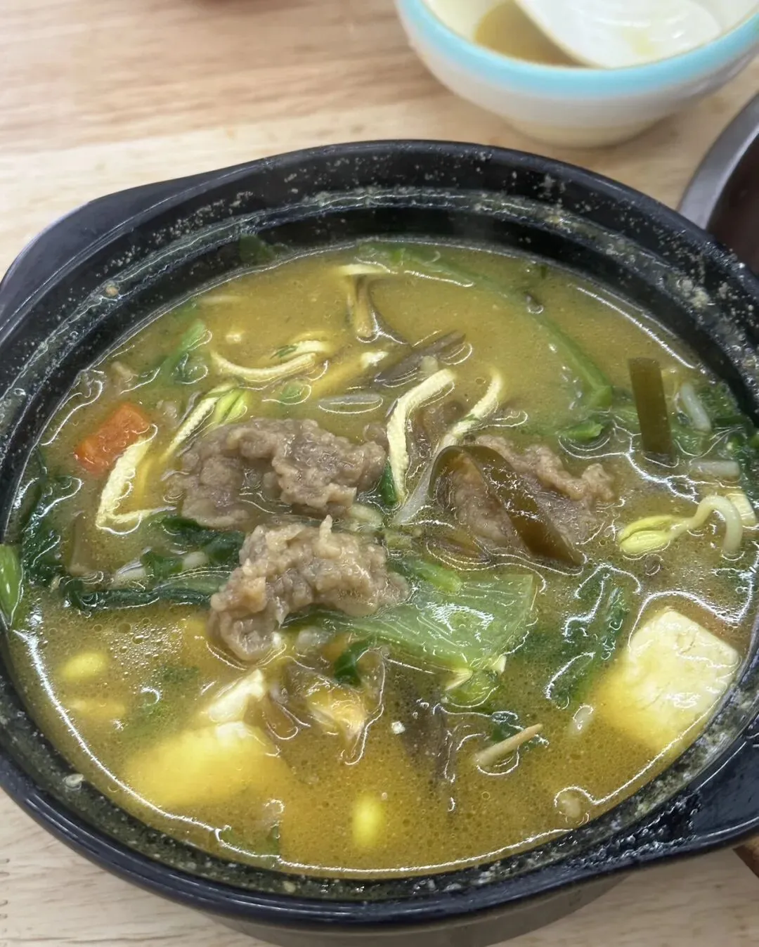 汤里的白胡椒味很香,里面有青菜、木耳、金针菇等各种配菜,喝起来酸辣开胃,特别实在。一份汤能当一份菜吃,性价比超高~