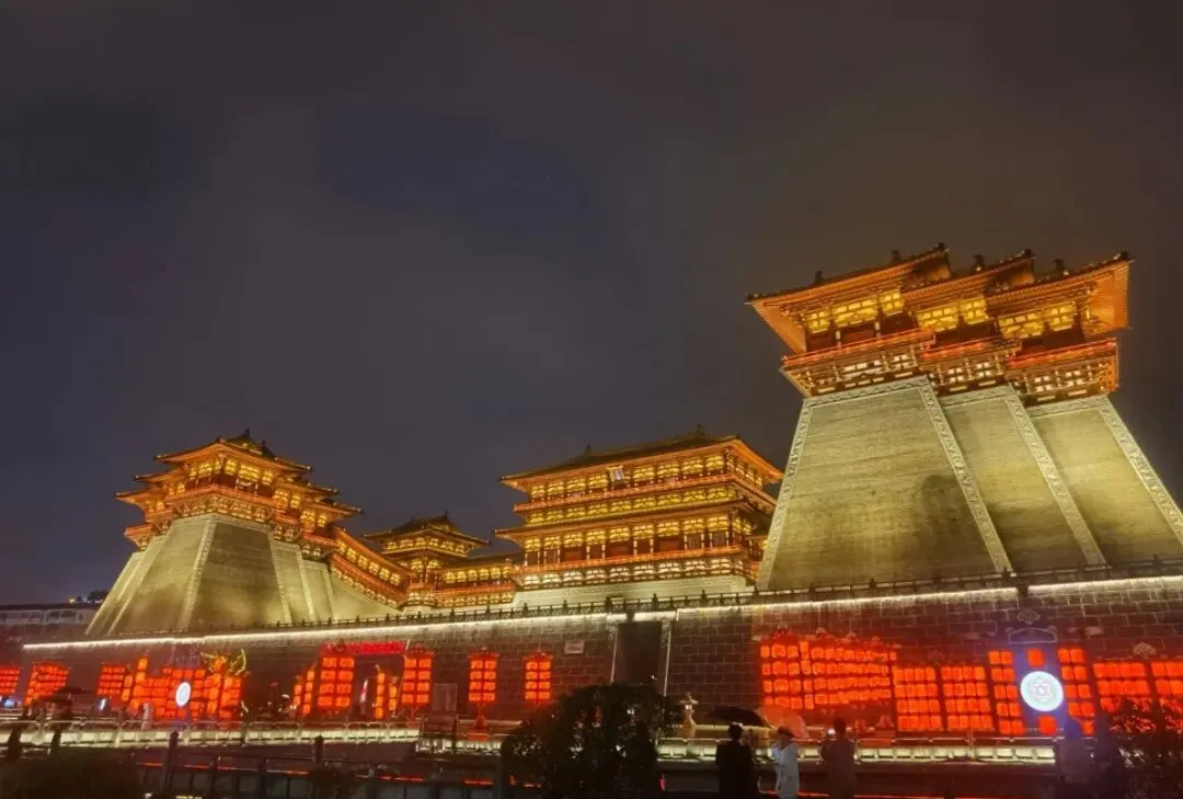 震撼于科技的光芒。一道道金色的光束,勾勒出城楼飞檐的每一道脊线,层叠的阙楼、高耸的朵楼,次第从黑夜里浮现,通体流转着一种温润又凛冽的金辉。红灯笼在风中轻晃,烘托出帝国的庄严与辉煌,这是一眼千年的繁华,非同寻常的璀璨。