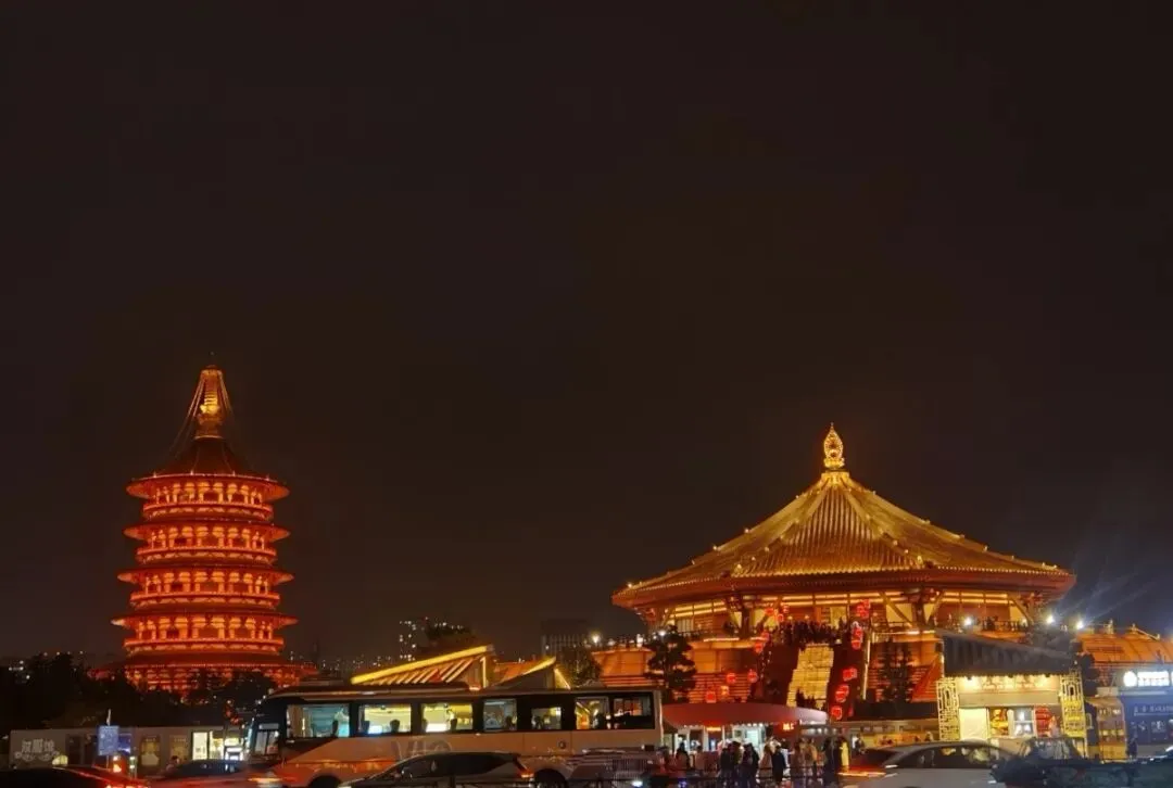 夜色中再到应天门、明堂天堂景区。白天有过一轮参观,看到的是建筑的宏大、肃穆,日光下,到处都有现代工艺的痕迹,漠然。