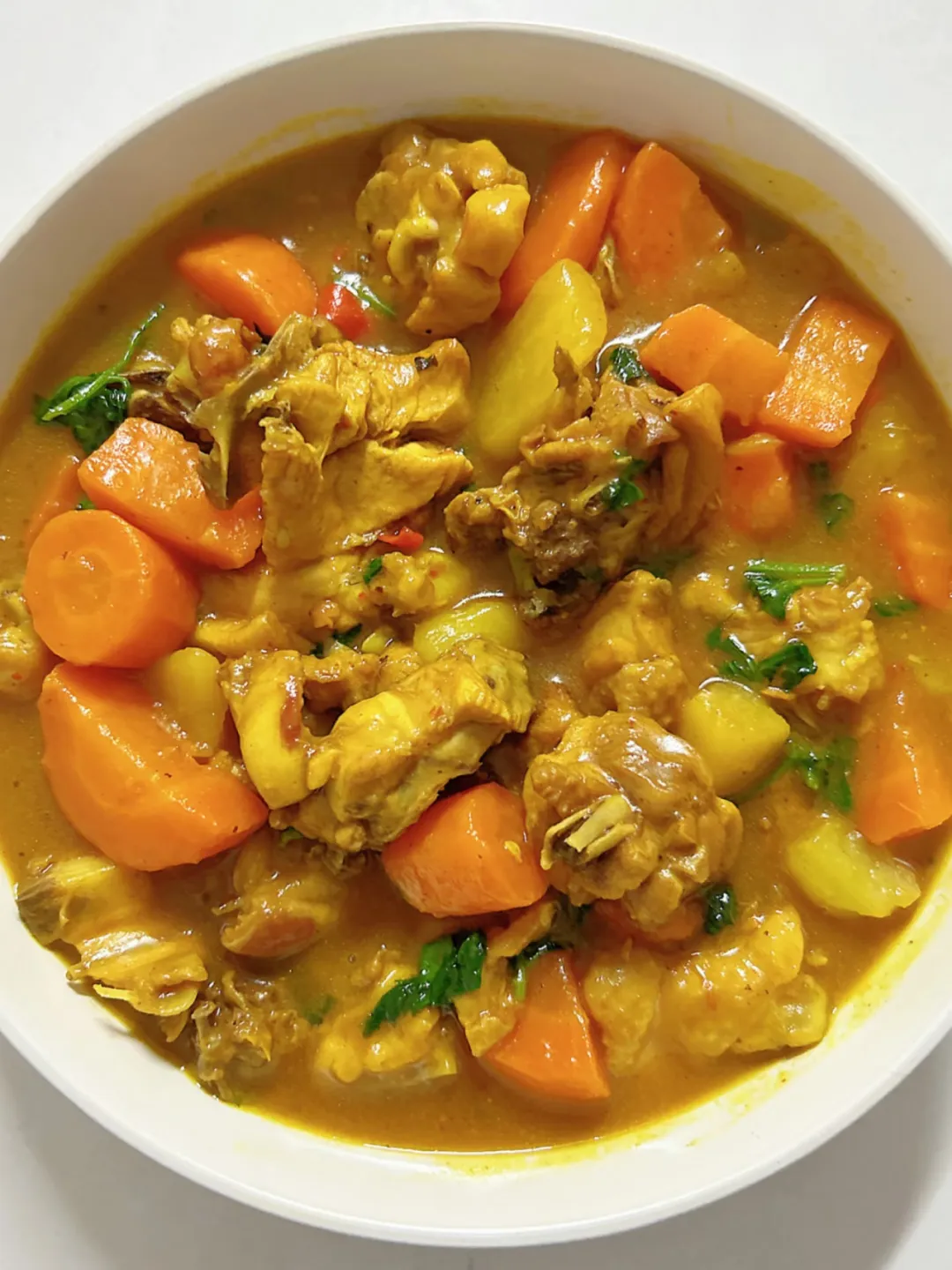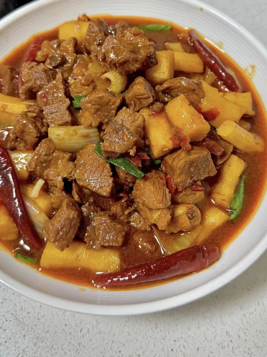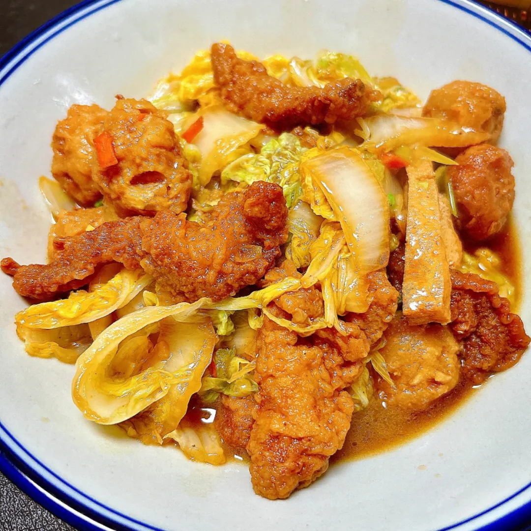 热菜:咖喱鸡块、白菜烧酥肉、青椒绿豆芽